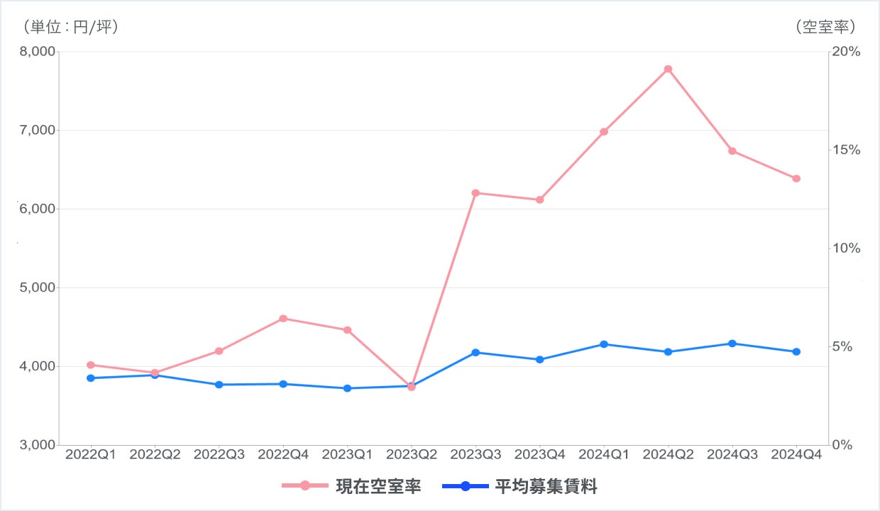 空室率は2023Q3から急増も、2024Q3より連続で減少。募集賃料は空室率の影響を受けることなくほぼ横ばいで推移。