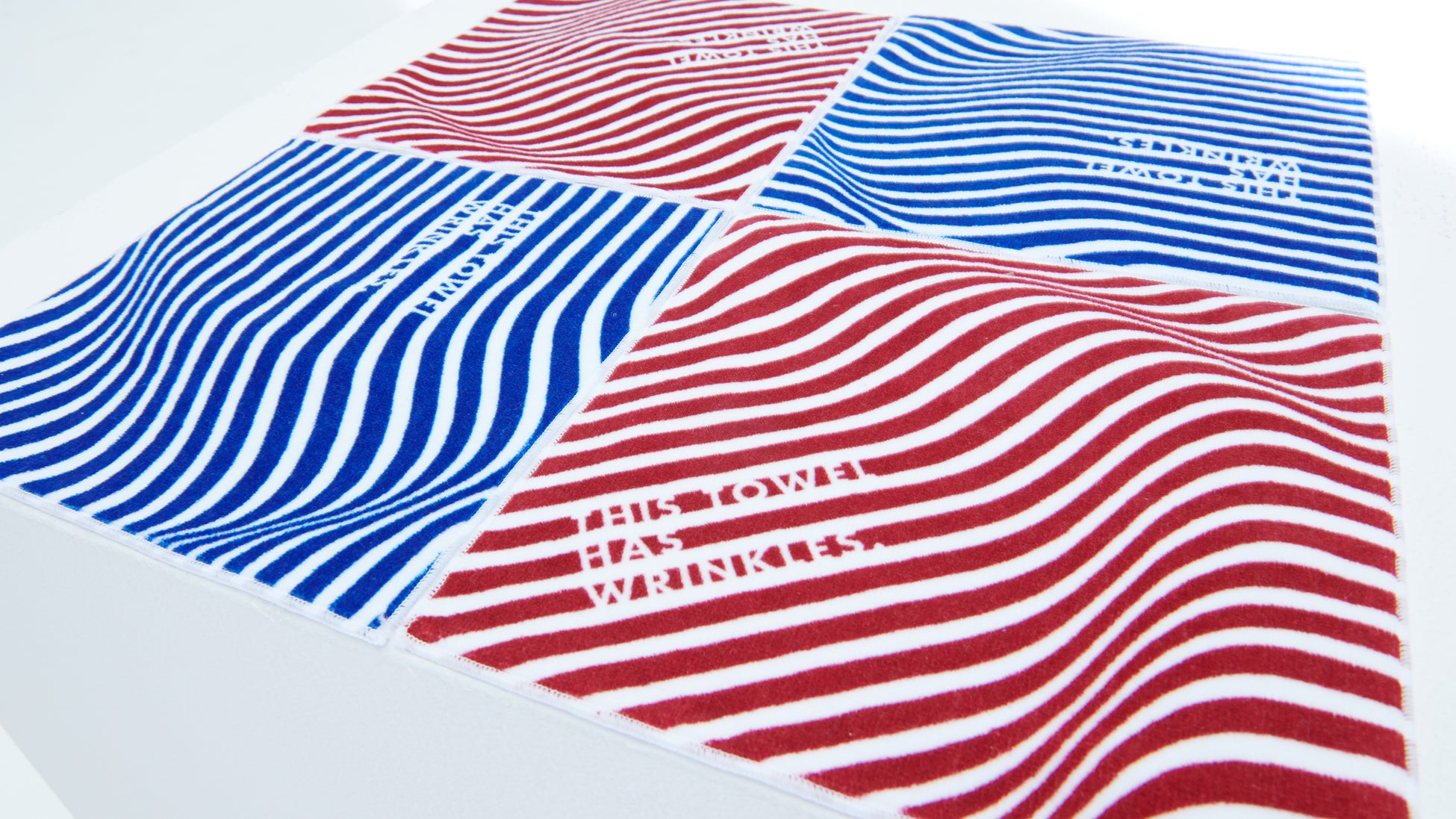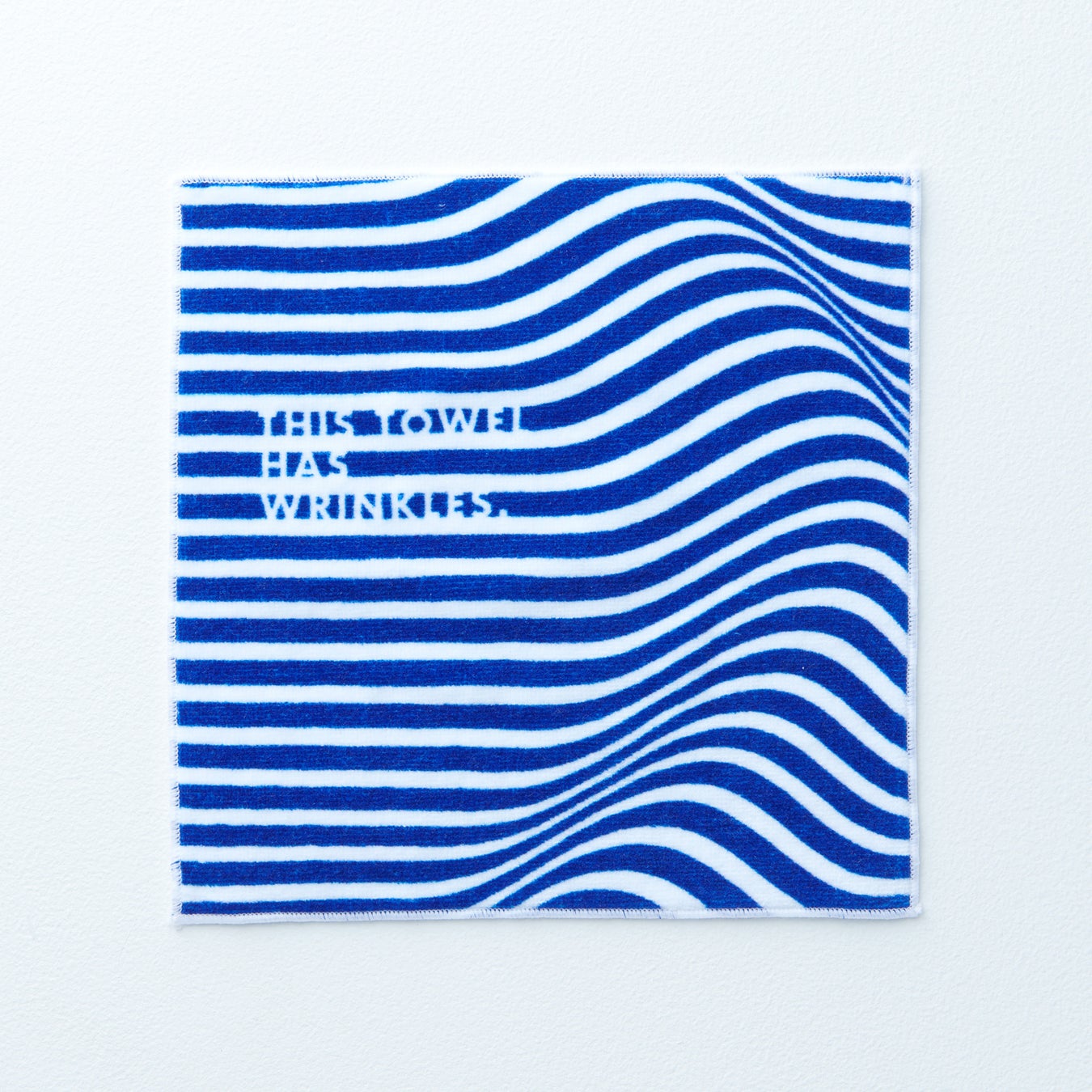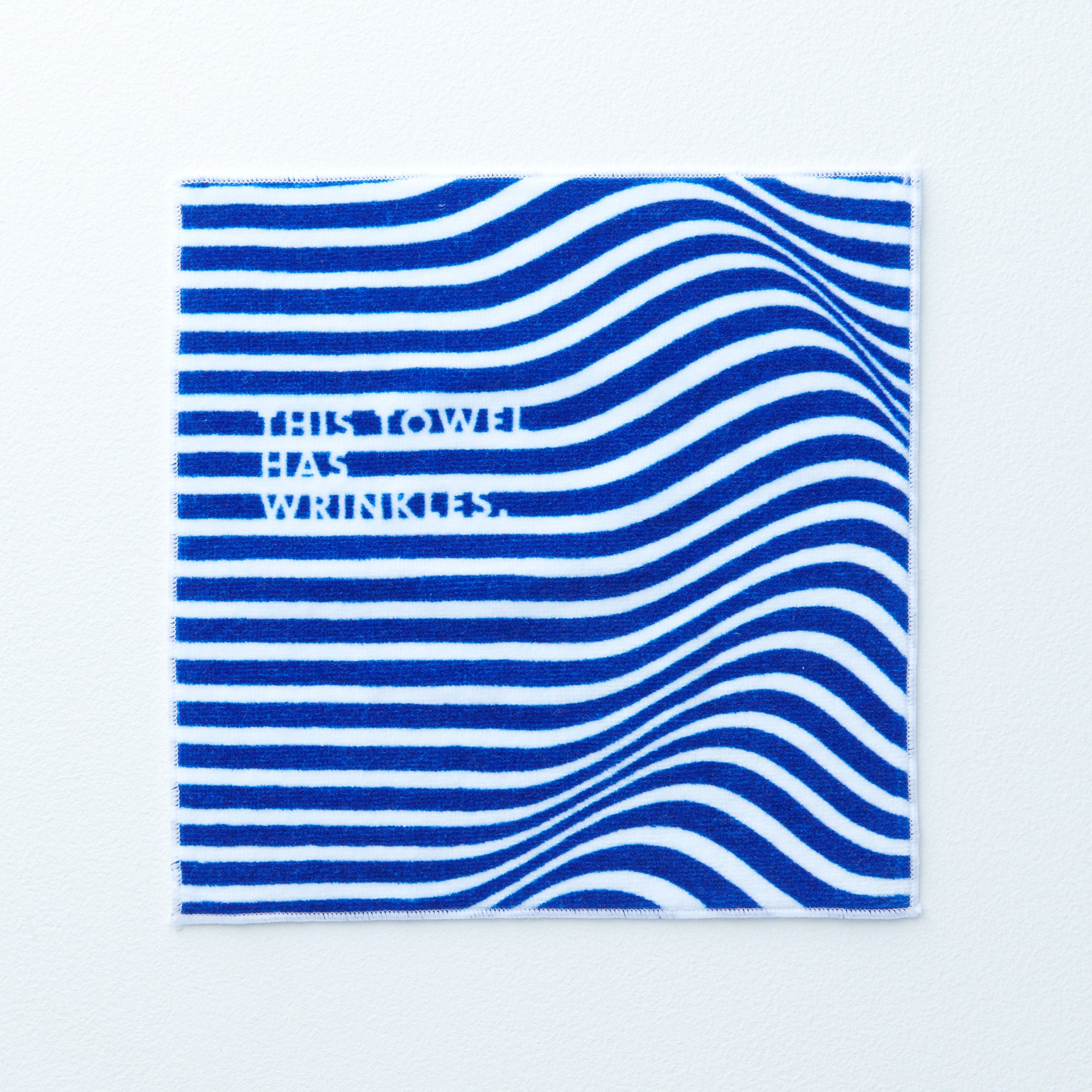 どんなにシワを伸ばしても、なんだかスッキリしないミニタオル。不良品ではありません。明るい青と赤の2カラーをセットにしています。畳んでいる時、手を拭いている時にはスタイリッシュなボーダー柄、でも、広げてみると不思議な感覚が拭えない錯視風のデザインになっています。