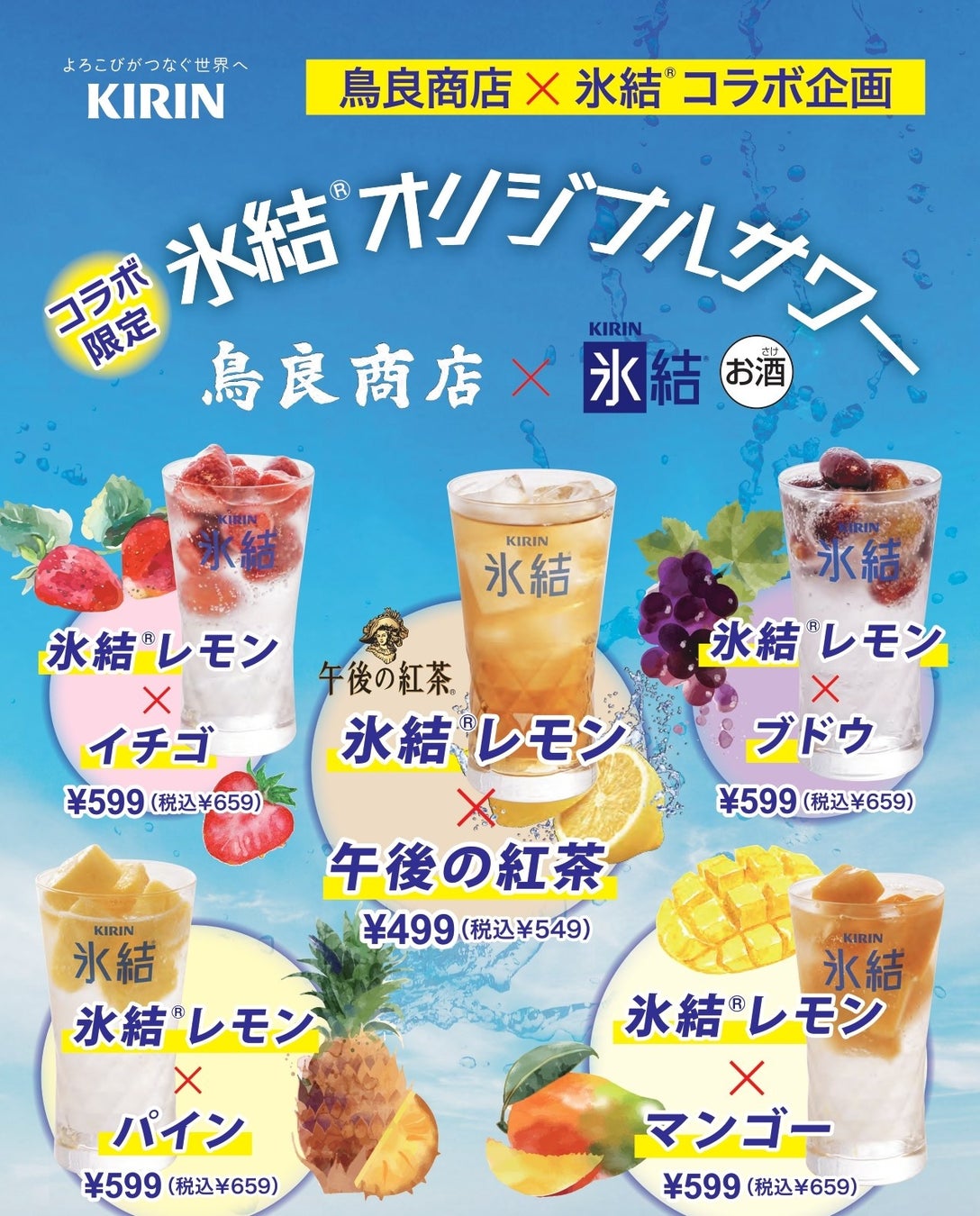 本企画では、『鳥良商店』の鶏料理に合わせて開発された氷結®オリジナルサワー(全5種)の味わいが鶏料理の美味しさを一層引き立てます。また、氷結ブランドオリジナルのダイヤカットが施された特製グラスでご提供し、特別価格にてお楽しみいただけます。
