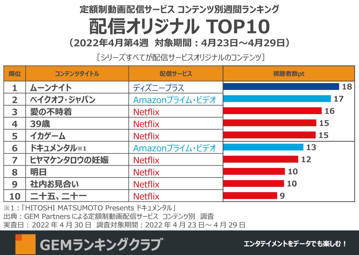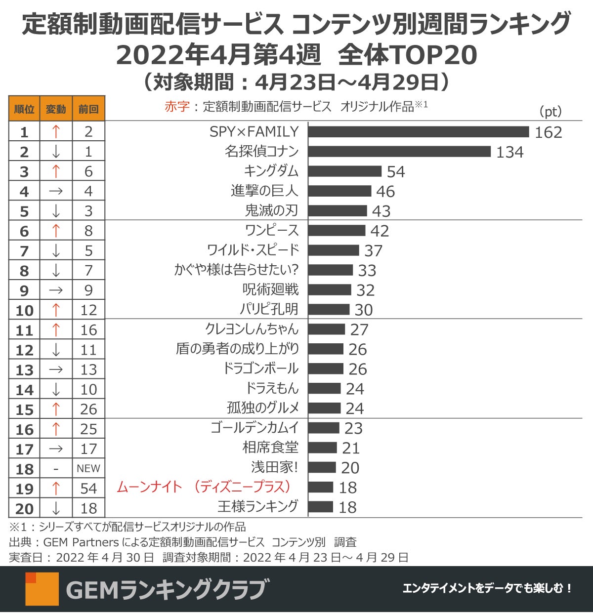 『SPY×FAMILY』初の首位、オリジナルはディズニー『ムーンナイト』、アマプラ『ベイクオフ』がTOP2~定額制動画配信サービス コンテンツ別週間ランキングTOP20(2022年4月第4週)
