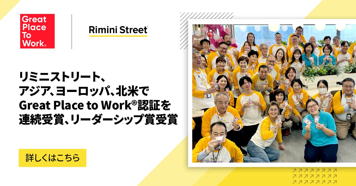 (米国ラスベガス – 2025年3月20日)– エンタープライズソフトウェアのサポート、イノベーションソリューションをエンドツーエンドで提供するグローバル企業であり、Oracle、SAP、VMwareソフトウェアに対する第三者保守サービスの主要なプロバイダーであるRimini Street, Inc.(Nasdaq: RMNI)は、本日、日本、イスラエル、シンガポール、英国、米国において複数年連続で「Great Place to Work®」認定を受けたこと、さらに韓国の「Best Workplaces™」において、リミニストリートのCEOであるSeth Ravinが「最も尊敬されるCEO賞」を受賞したことを発表しました。