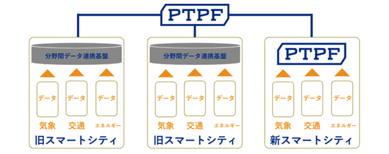 各都市、各分野でバラバラにスマートシティ化に向けて進んでいたデータ活用でしたが、IoTデータにPTPF™プロトコルというブロックチェーンを活用した共通言語を持たせることでIoTデータの取引が可能となり、開発コストをかけることなくあらゆる分野や都市で横断したデータの活用が容易にできます。