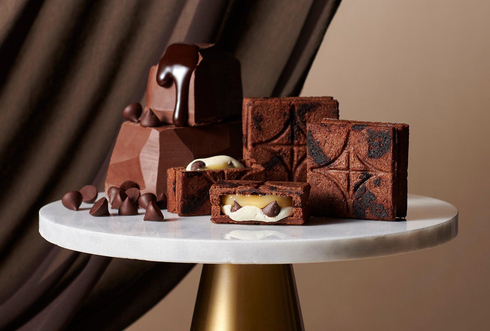 毎年多くのお客様からご好評いただき、今年4度目の出店となる「PRESS BUTTER SAND」からは、今年も「2024アムール・デュ・ショコラ」限定で、店舗にて実演販売するチョコレートのバターサンド3種を販売します。「焼きたてチョコチップクッキーサンド」は、ペルー産のチョコチップとウガンダ産のローカカオニブをクッキーに練り込むことで、カカオ本来の苦味や奥深さを感じる味わいに。ショコラを纏ったバターサンド〈マロン〉と〈苺ショコラ〉は、バターサンドにミルクのコーティングチョコをまとわせた、ショコラを存分にお楽しみいただける商品となっています。