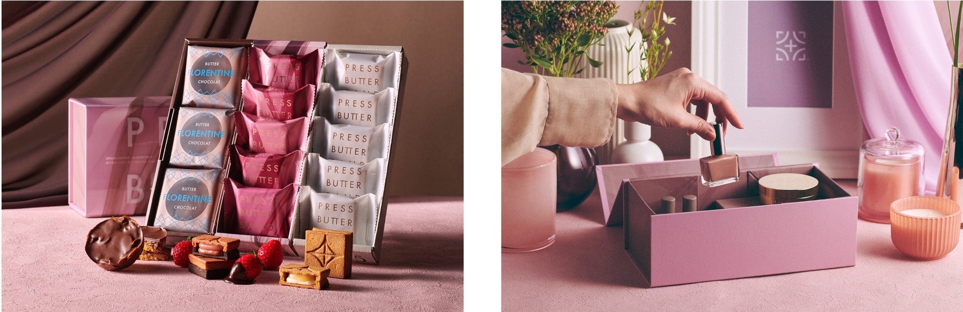 その他、新商品「バターフロランタン〈ショコラ〉」が入った特別セットや、期間限定のバレンタインデザインとしてクラシックピンクをベースにデザインされた「バターサンド〈苺ショコラ〉」、定番ラインナップとして人気のショコラ商品も販売いたします。