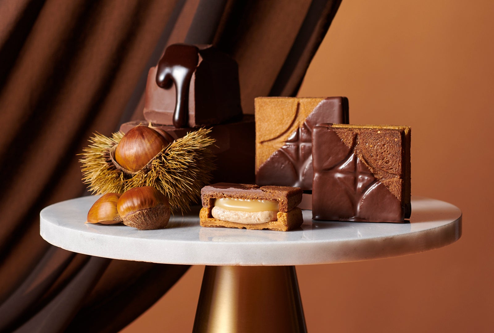 イタリア産の栗から作ったマロングラッセを加えた濃厚なバタークリームや2種の生地を使った贅沢な味わいのバターサンドに、ミルクのコーティングチョコを纏わせました。マロンの香ばしさをミルクショコラの甘さが包みこみます。