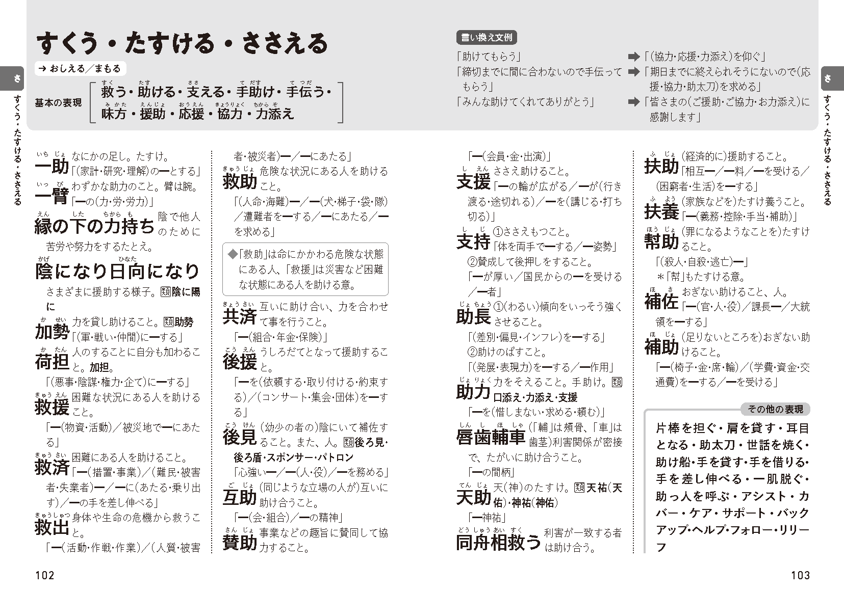 基本的な言葉から、かたい文書向けの漢字熟語や気のきいた表現まで探すことができます。例文には結びつきやすい言葉をたくさん示しています。