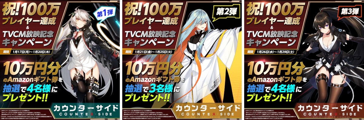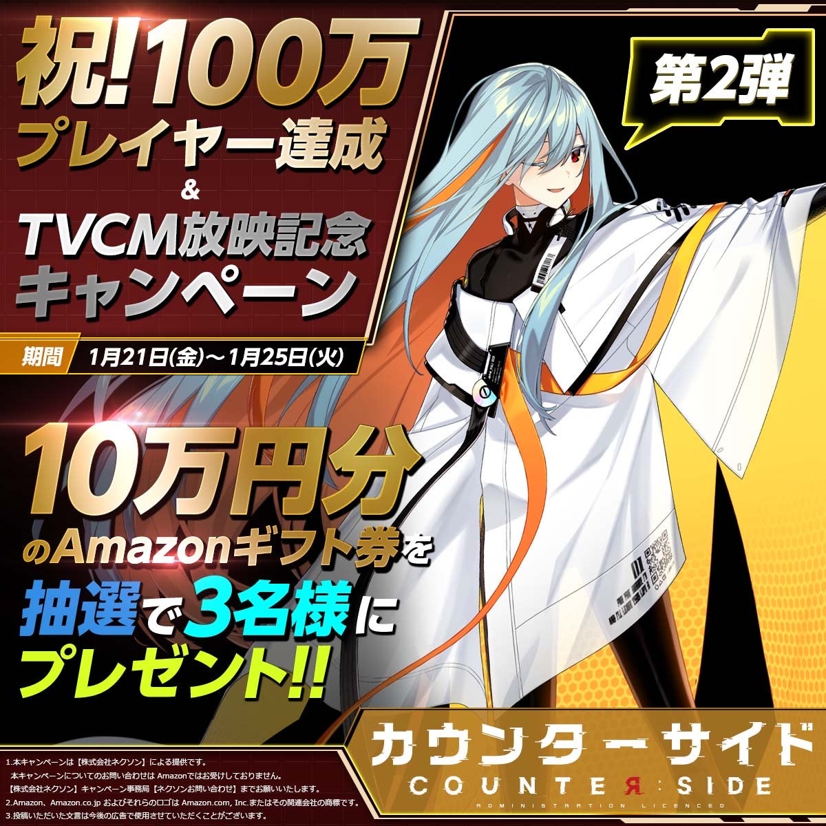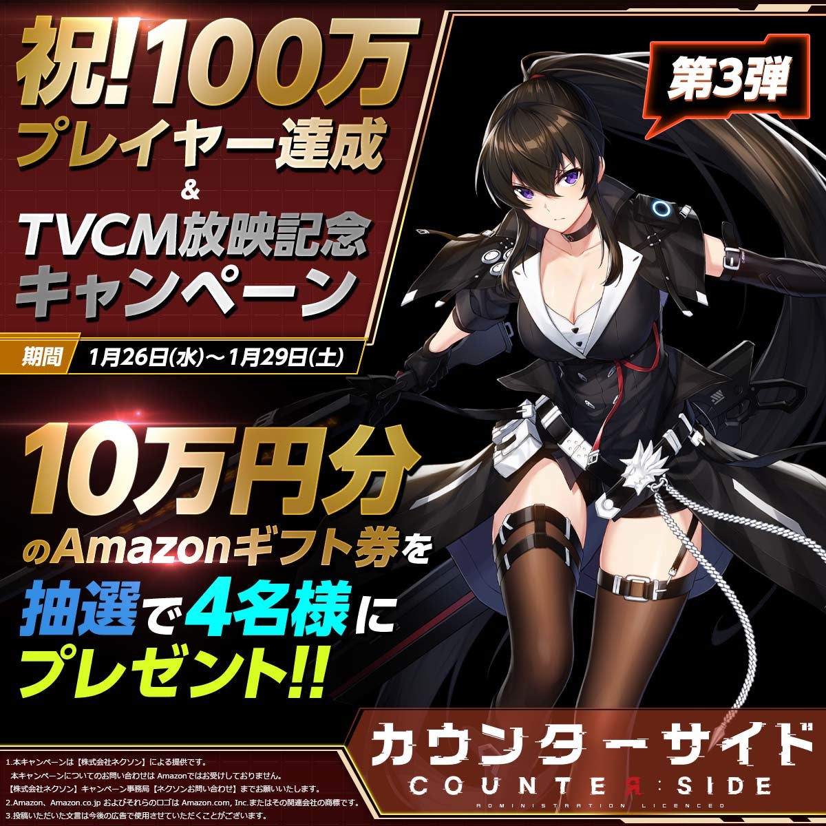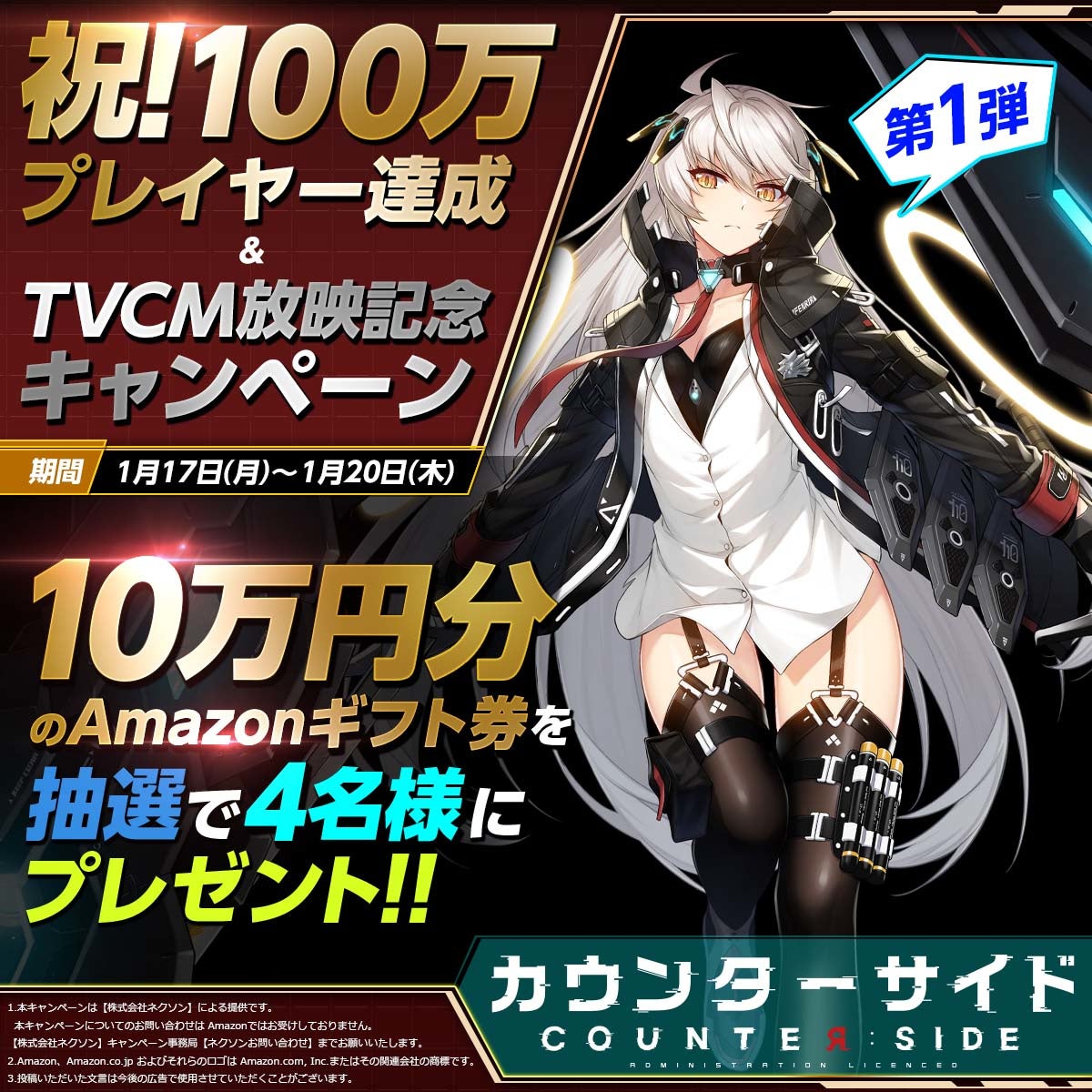 100万プレイヤー達成ならびに、関東・関西圏でのTVCM放送開始を記念して、総額100万円分のAmazonギフトコードが当たるTwitterキャンペーンを開始いたしました。