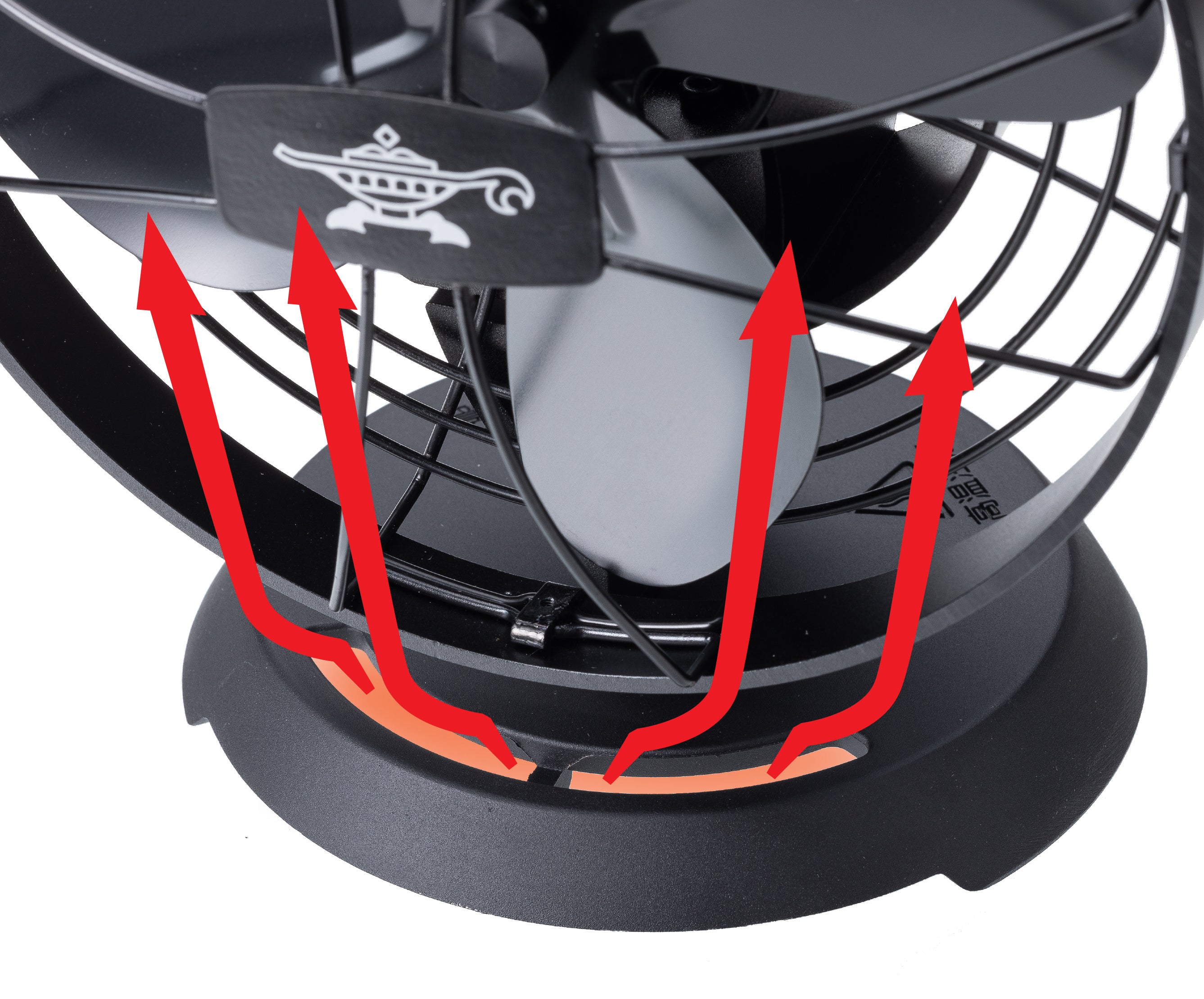 熱を効率的に集める専用ベースが1.5倍の風量を生み出し、対流式のアラジンストーブの上に置くことで、電源いらずで暖かい空気を部屋中に循環させます。専用ベースは、アラジンストーブの天板にぴったりフィットする設計で安定感にも優れています。温風を集めて、より遠くへ熱を届ける創風リングは、部屋の隅々まで暖かい空気を届けストーブの暖房効率を高めるとともに、回転中のファンに手が触れるのを防ぐガードの役割もあります。機能だけでなく、丸みを帯びたアラジンストーブとのバランスにもこだわったデザインです。