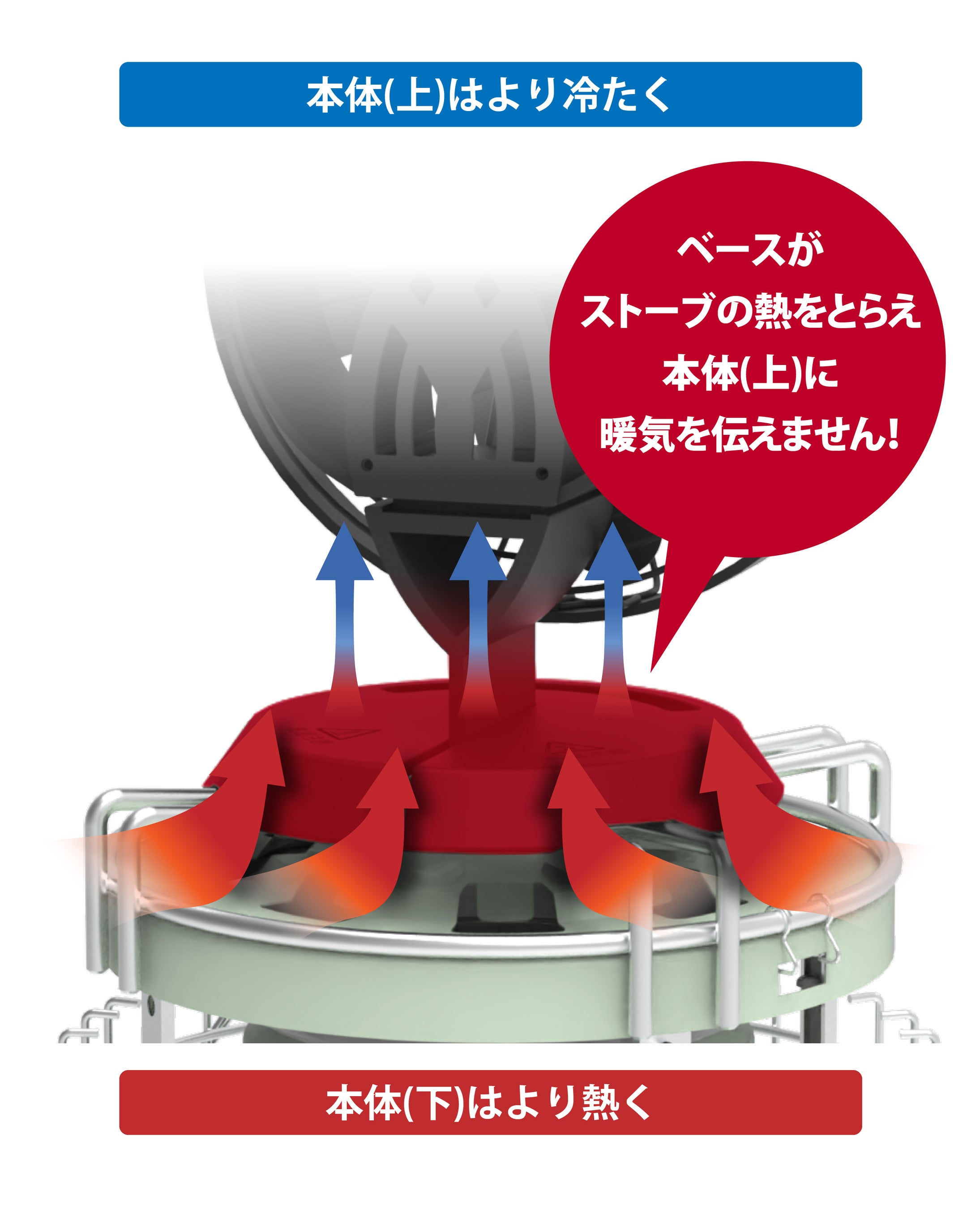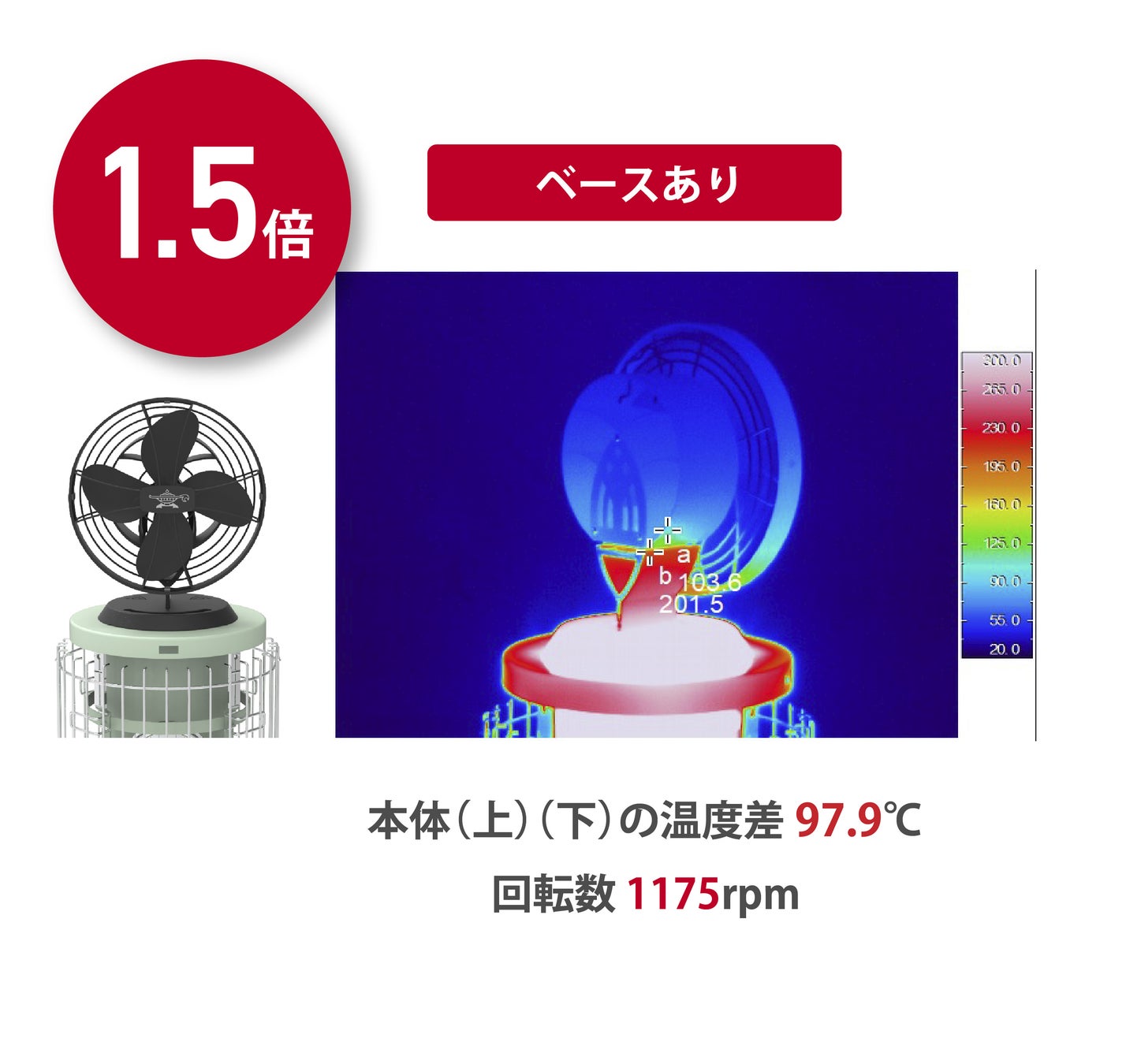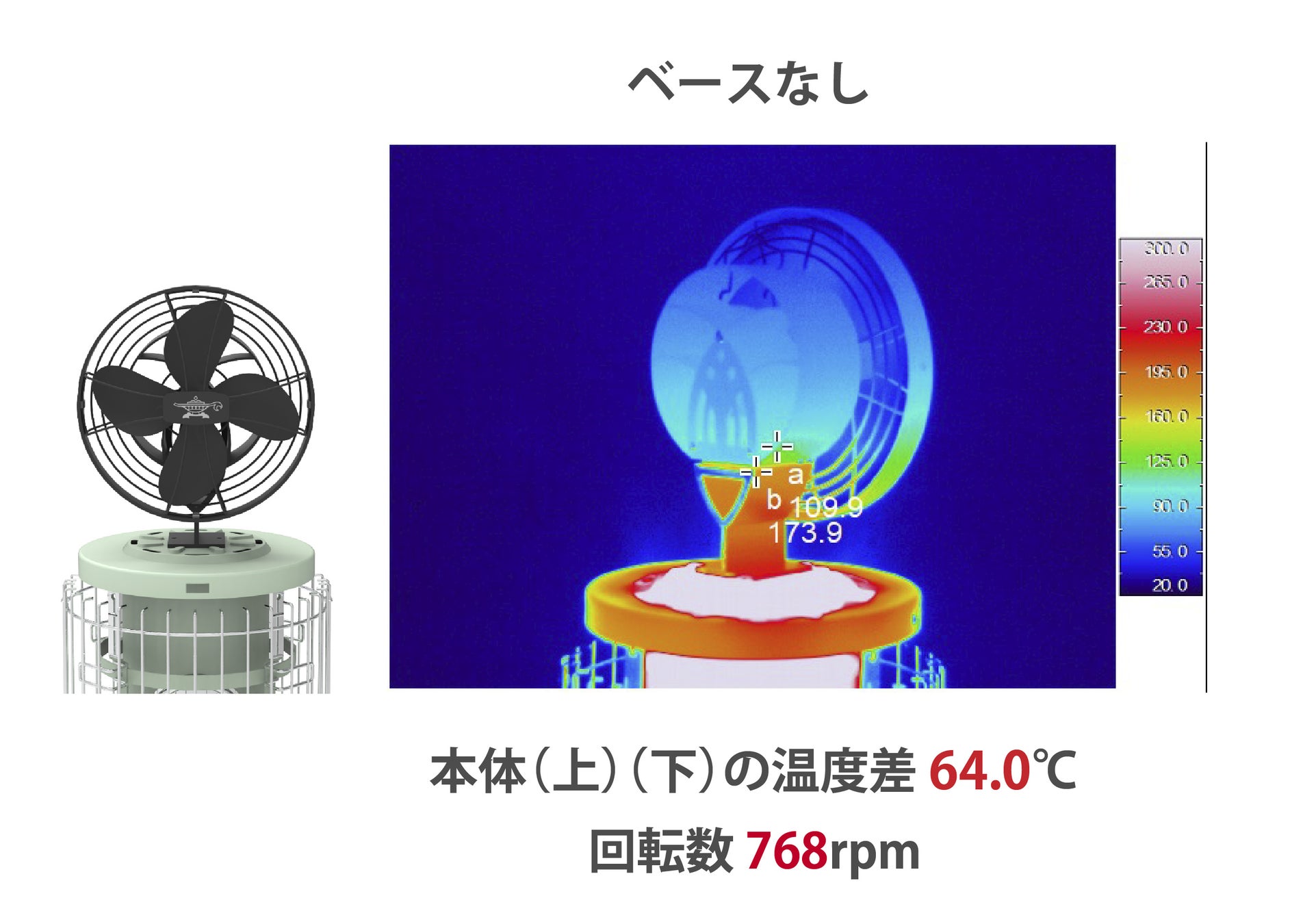 ベースがないと熱が上に逃げてしまうので本体(下)が温まりにくく、代わりに本体(上)が温まってしまい温度差が小さくなることで風量は弱くなってしまいます。一方、専用ベースがあるとストーブの熱を効率的に集め、本体(上)(下) の温度差を大きくすることで1.5倍の風量を生み出します。