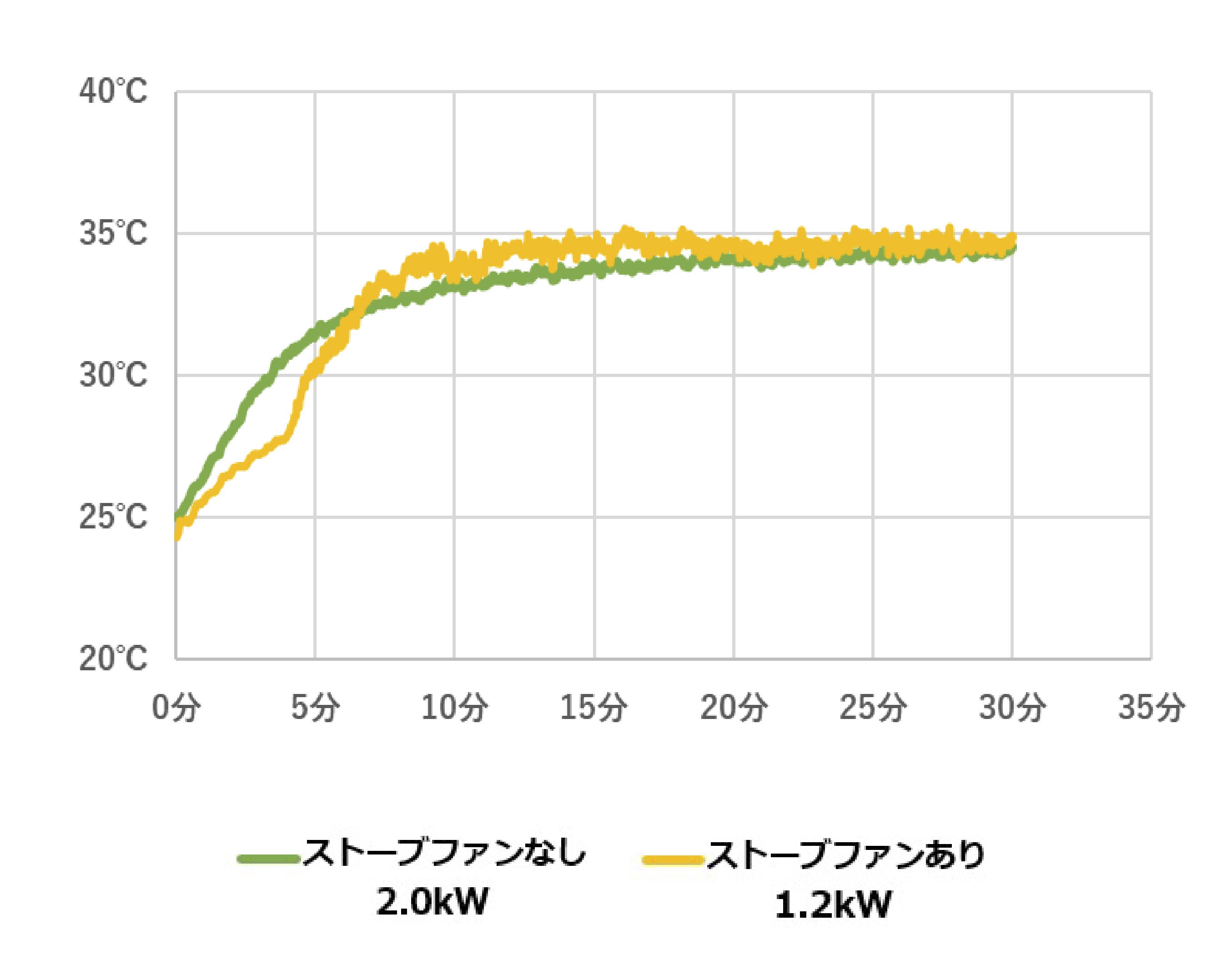 試験条件:約幅3m×奥行3m×高さ2m=18㎡の空間内で、ストーブファンから前方50cmの距離における幅100cm×高さ70cmのエリア内9点の平均温度を測定 |