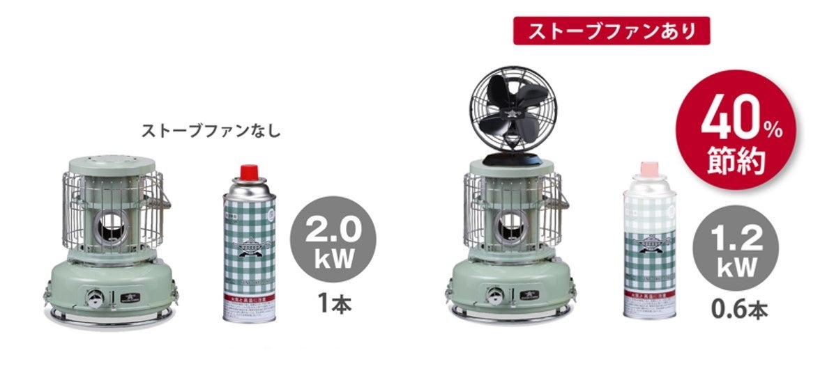 電源いらずで効率的に空間を暖めることで燃料の節約になり経済的。ガスストーブにおいては、ストーブファンがない場合の暖房出力2.0kWに比べて、ストーブファンがあれば暖房出力1.2kWでも同じ体感温度になります。小さい火力で済むので、燃料の節約になります(自社調べ)。さらに、カセットボンベの使⽤本数が減るため、年間3,300円節約可能で、⼿間のかかる廃棄や備蓄の補充回数も少なく済みます。