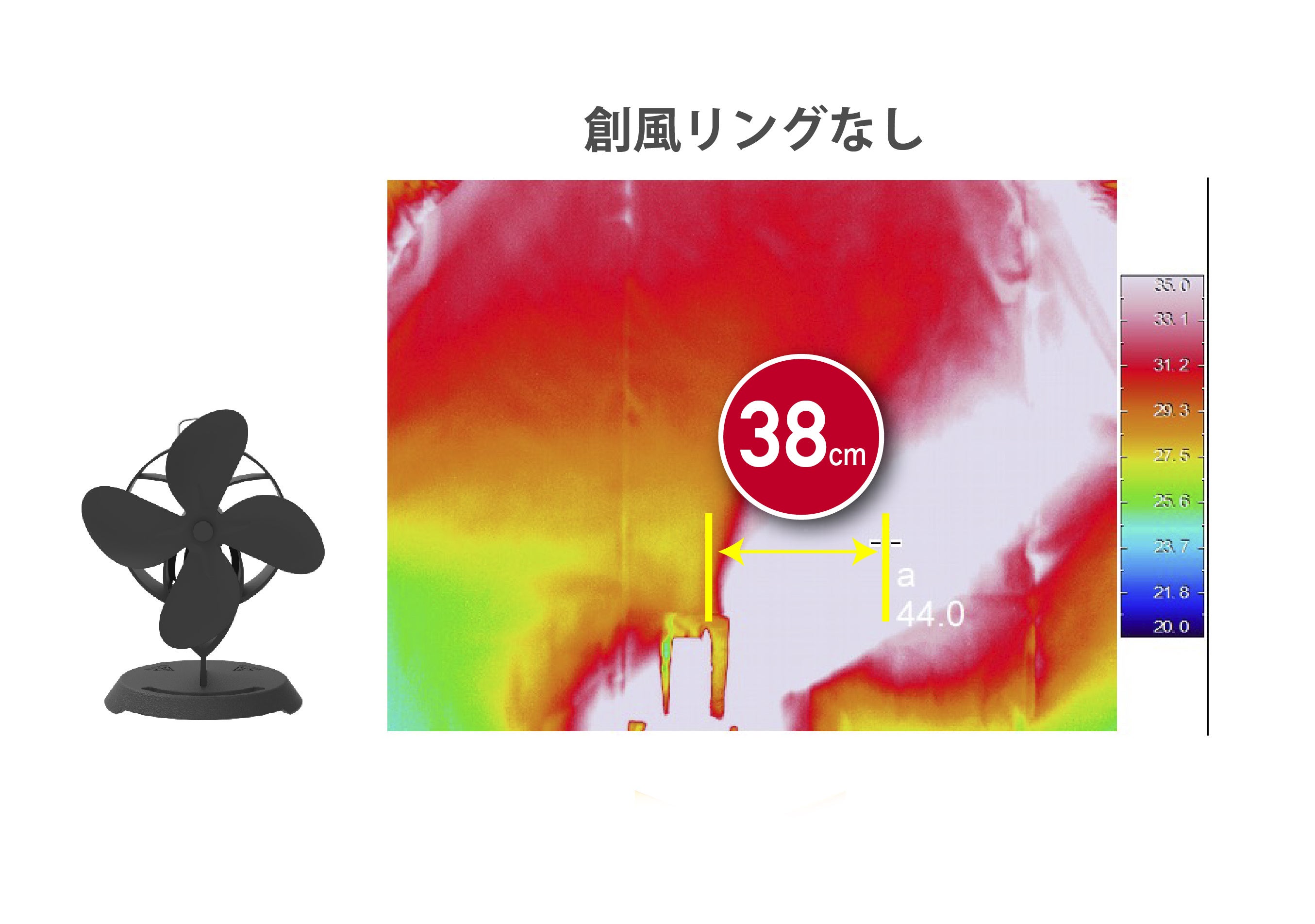 +14°Cの温風が創風リングなしでは38cm先まで届いているのに対し、創風リングありでは53cm先と15cmさらに遠くへ熱を届けることができます。