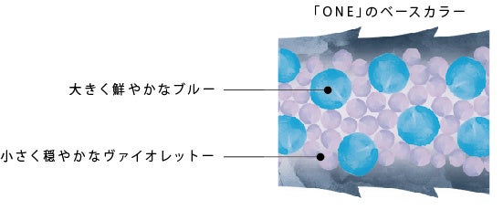 これまでよりも大きく鮮やかなブルー染料と、小さく穏やかなヴァイオレット染料を掛け合わせ新たなベースカラーを設計。大きさの異なる染料が髪内部を効率的に埋めることで、10分で赤みを抑えつつ、毛先までやわらかく透明感のある発色を可能にしています。