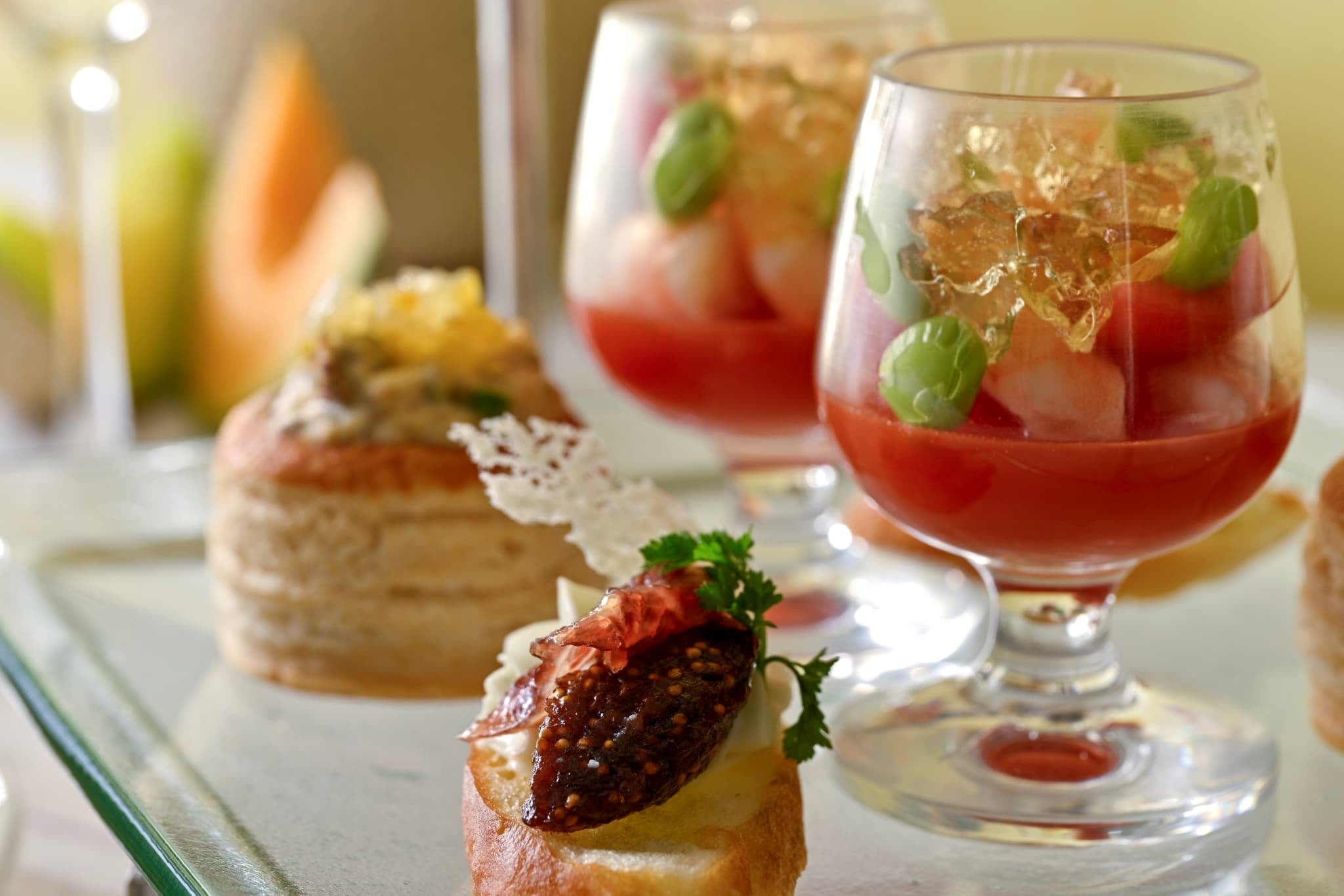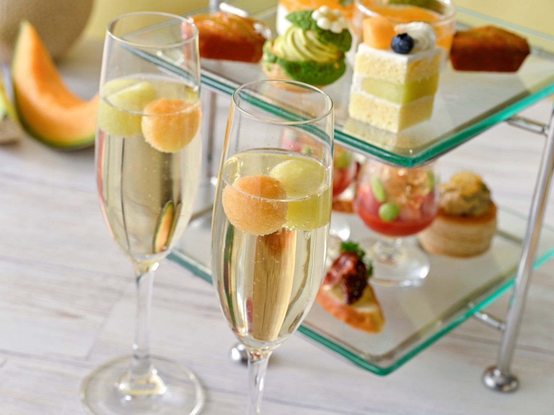 本アフタヌーンティーでは赤肉と青肉のメロンを、ジュレやピューレ、クリームなどさまざまな形に仕立て、趣向を凝らした多彩なスイーツとしてご堪能いただけます。