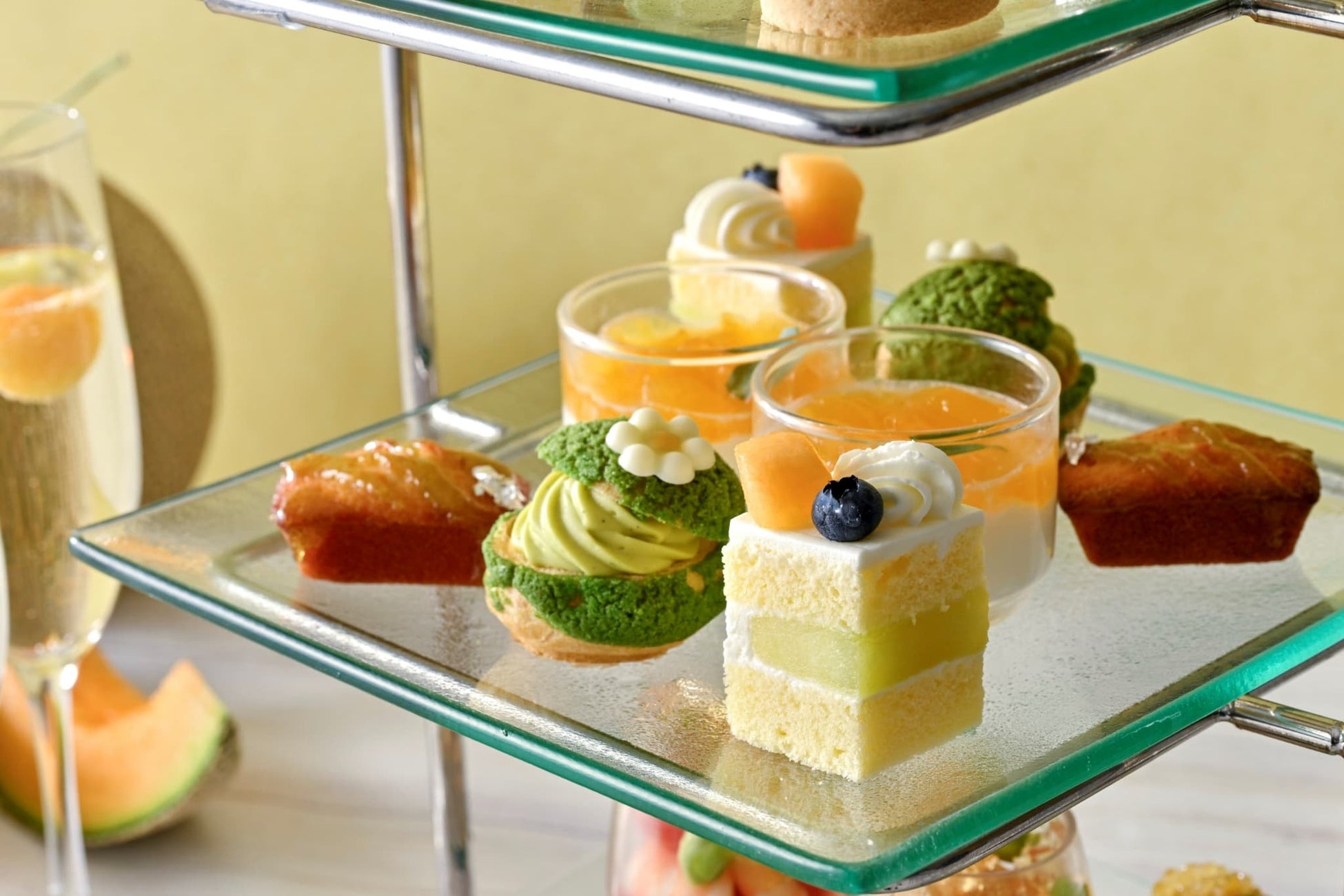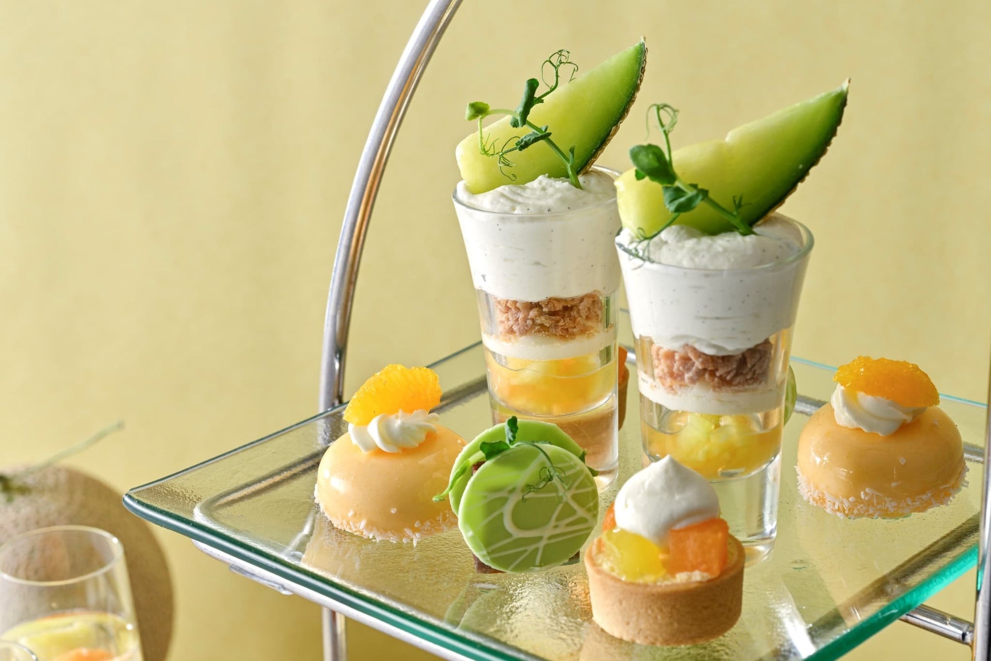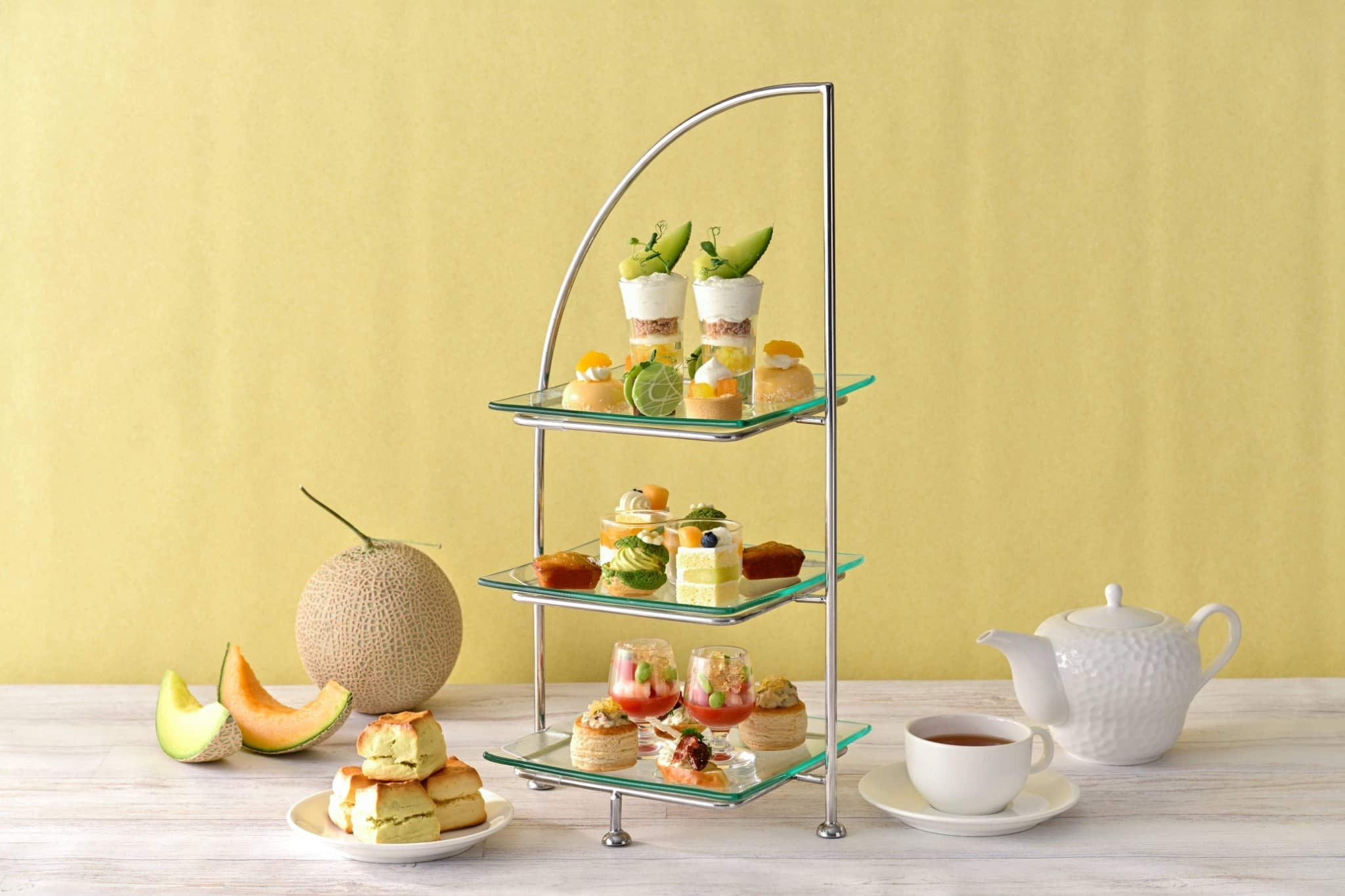 ホテルの外観をかたどったティースタンドの最上段には、赤肉と青肉メロンを細かく砕いた“コンカッセ”に、マスカルポーネシャンティなどをたっぷり重ねた贅沢で華やかなグラスデザート「メロンとフロマージュのヴェリーヌ」や、メロンのグラサージュで覆われた艶やかなメロンのムース、紅茶が香るアーモンドクリームの上に赤肉と青肉のフレッシュメロンをあしらったタルトなど、爽やかな甘みとやさしいコクが溶け合う、夏の始まりにふさわしいスイーツを揃えました。