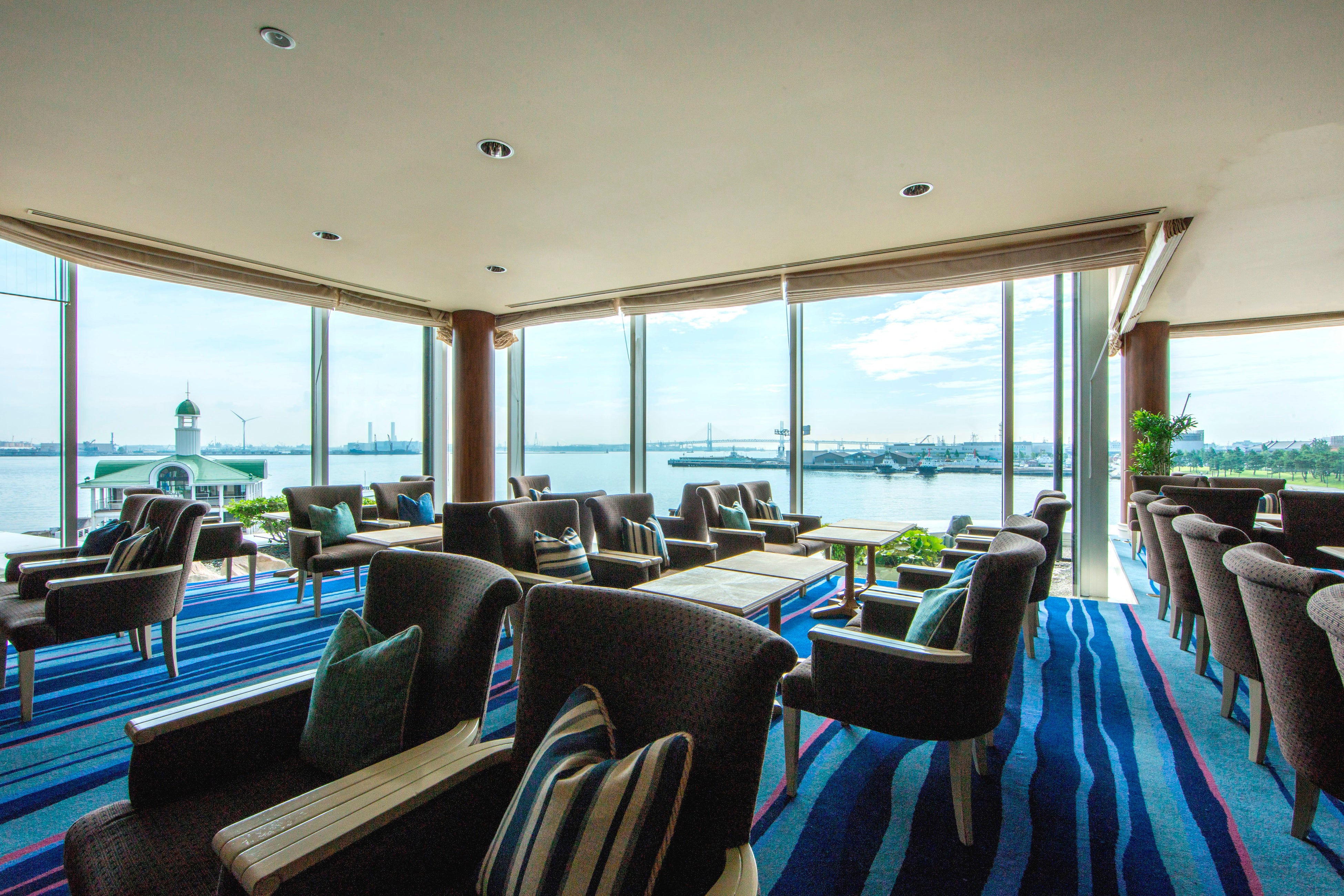 横浜港を一望できる開放感あふれるロビーラウンジ。海辺のリゾートをイメージした空間は、まるで豪華客船で旅をしているような寛ぎのひとときを演出します。自然光が降り注ぐ明るく開放的なティータイム、ベイブリッジの夜景を望むバータイムなど、時間とともに表情を変える景色とともに、さまざまなシーンでご利用いただけます。