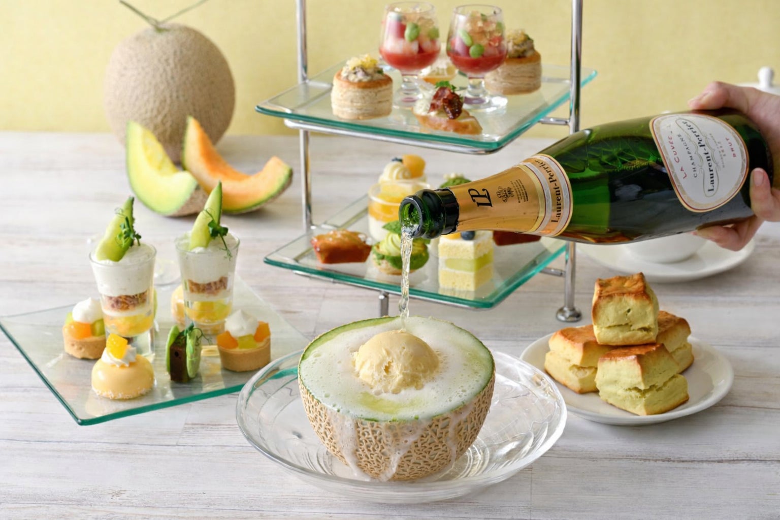 みずみずしいメロンにホテルメイドのバニラアイスをのせ、仕上げにシャンパンを注いでお楽しみいただけます。