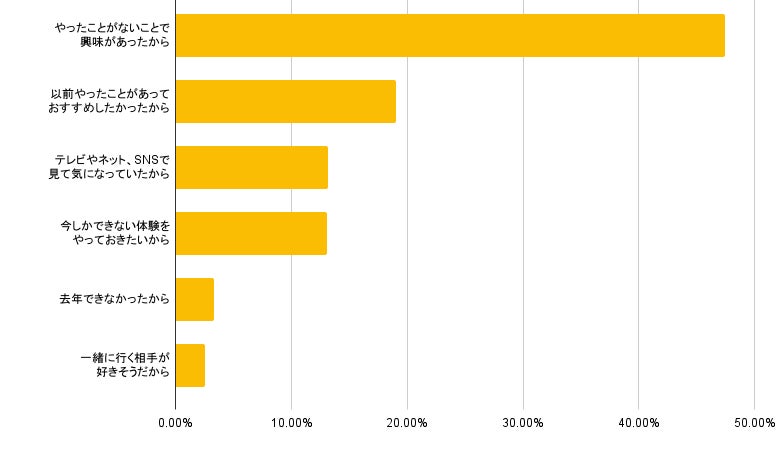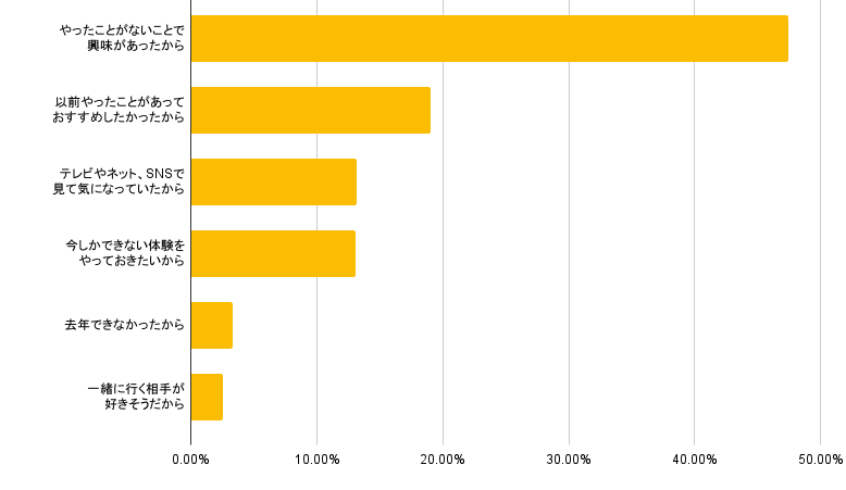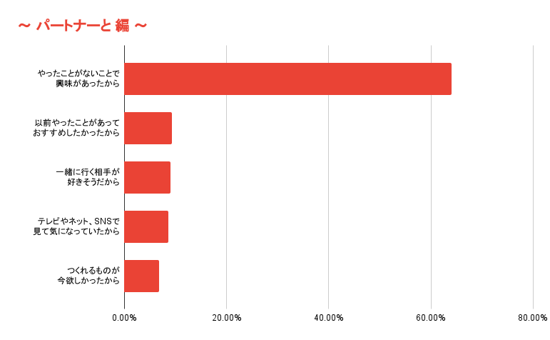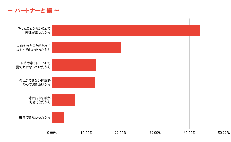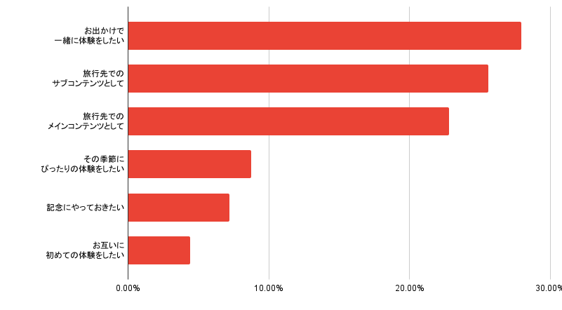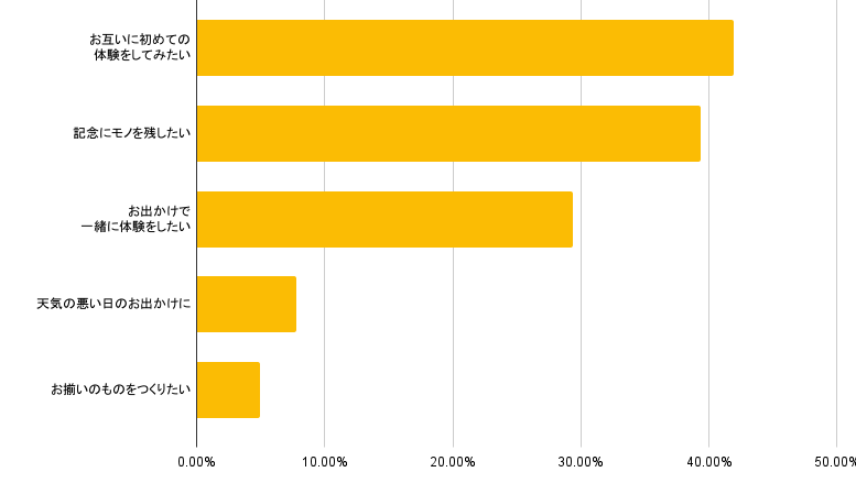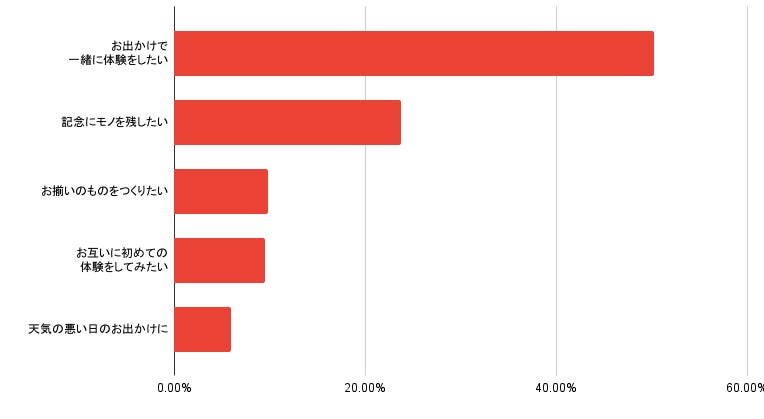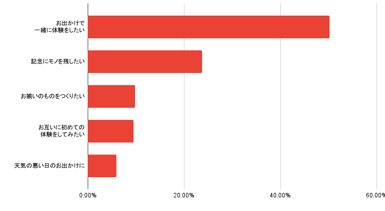 一方の「パートナーと」では、「お出かけで一緒に体験をしたい」という回答が半分以上という結果になりました。「パートナーと」のお出かけのシーンでは、「一緒に何かをする時間」そのものを大切に考えている人が多くなっています。