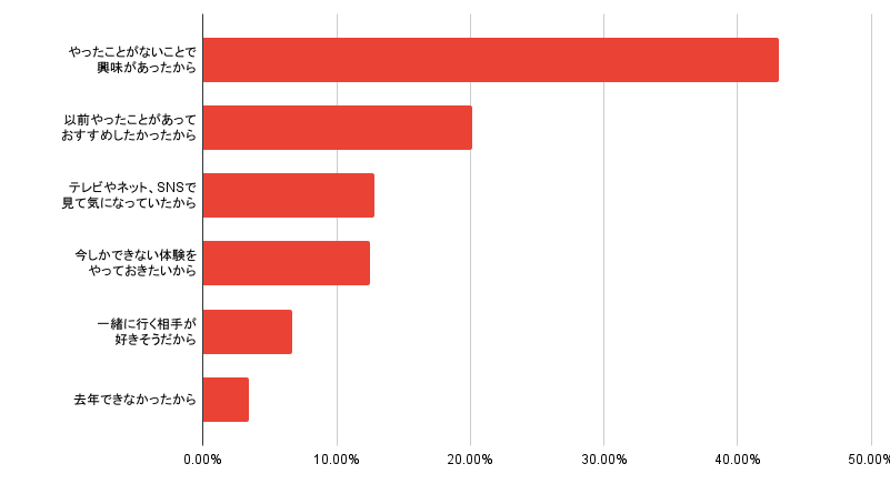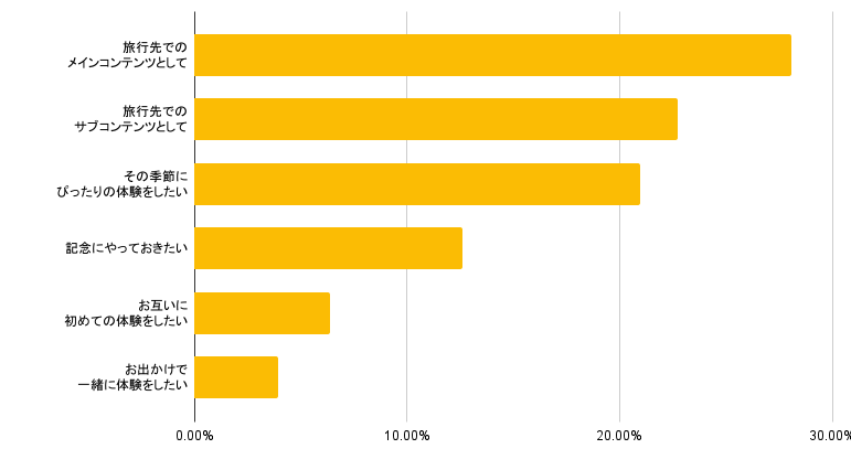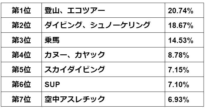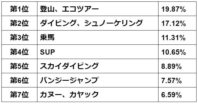 以前調査した「子供と」編では1位が「乗馬」でしたが、今回は対象年齢が高めの「登山、エコツアー」や「ダイビング、シュノーケリング」が上位に入ってきています。