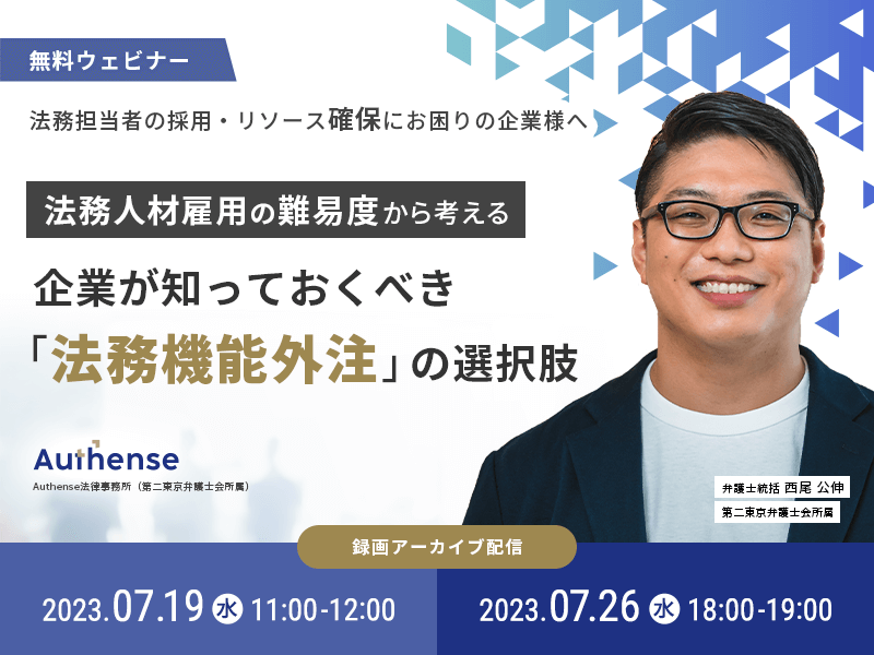 【無料ウェビナー開催2023.7.19/2023.7.26】法務人材雇用の難易度から考える 企業が知っておくべき「法務機能外注」の選択肢|Authense法律事務所