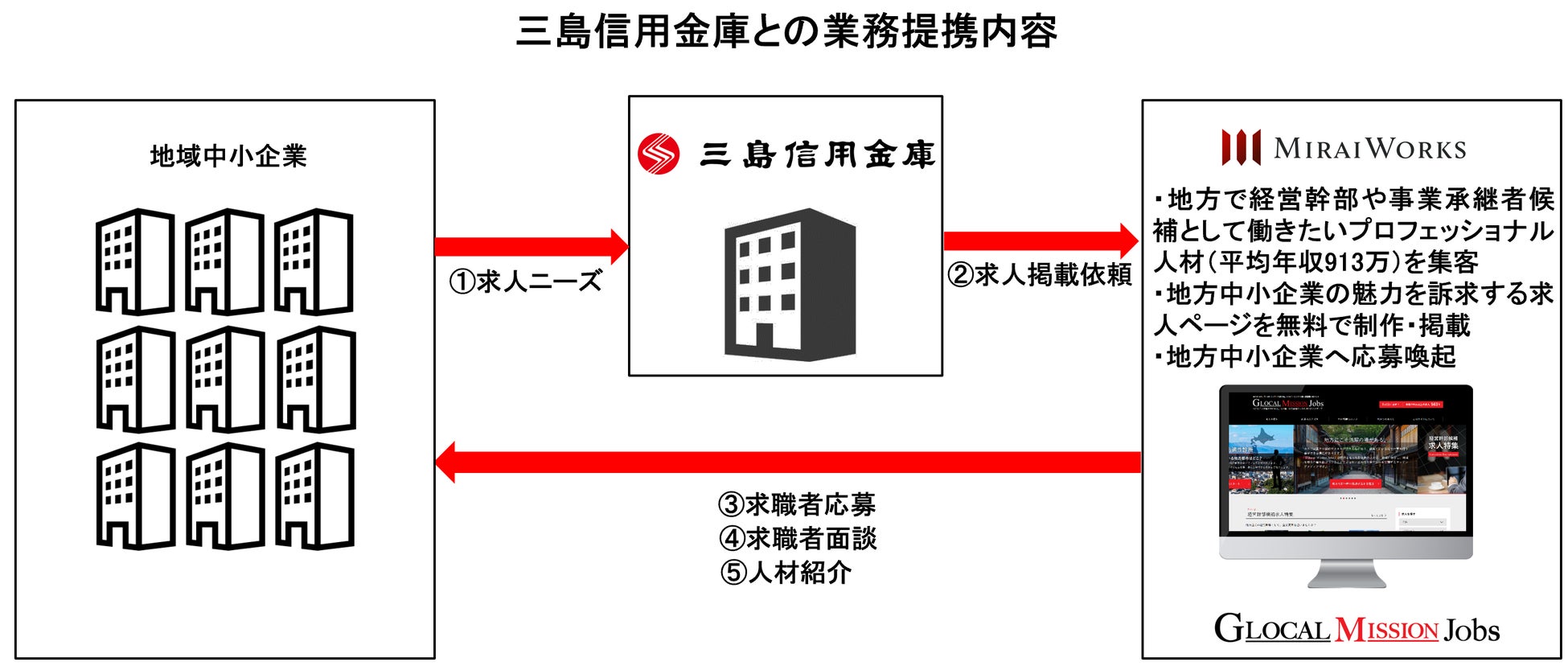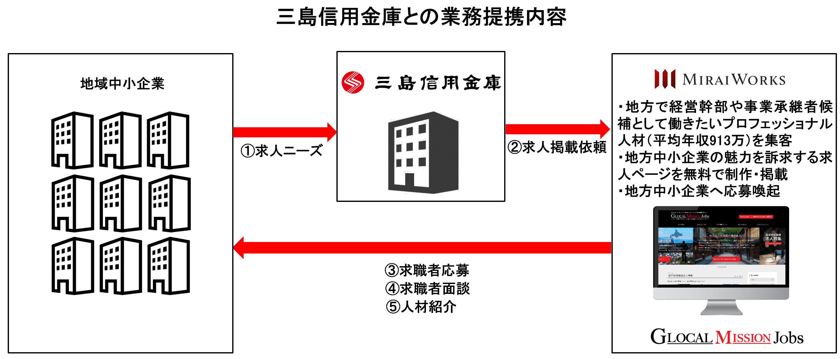 株式会社みらいワークス(本社:東京都港区、代表取締役社長 岡本祥治、以下「当社」)は、三島信用金庫(本店:静岡県三島市、理事長 平井敏雄、以下「さんしん」)と人材支援による地域企業の事業強化を目的とした業務提携契約を締結したことをお知らせいたします。また、今回のさんしんとの提携をもって、76の地域金融機関と地方転職・副業人材の活用を推進することとなります。