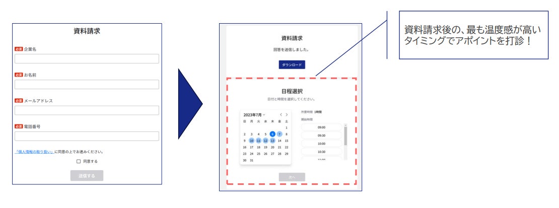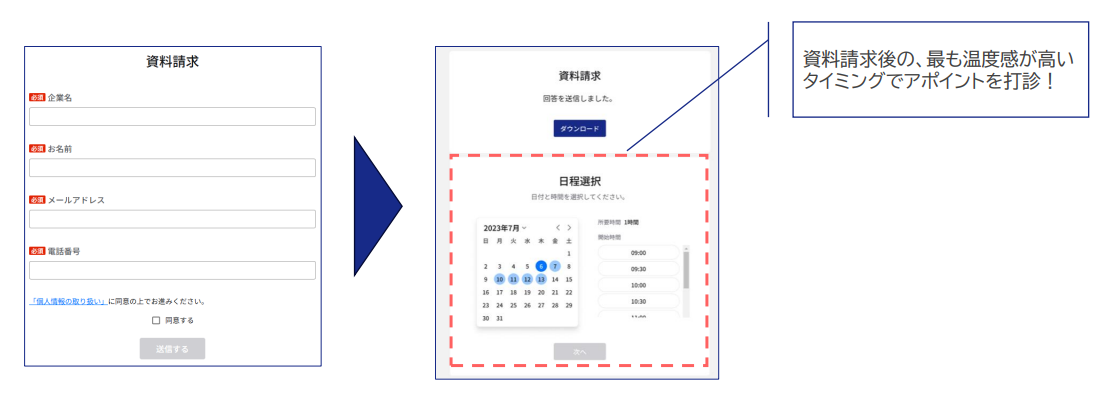 「楽楽メールマーケティング」のWebフォームと日程調整機能を連携させることで、資料請求後のサンクスページ上でアポイントの打診を行えます。