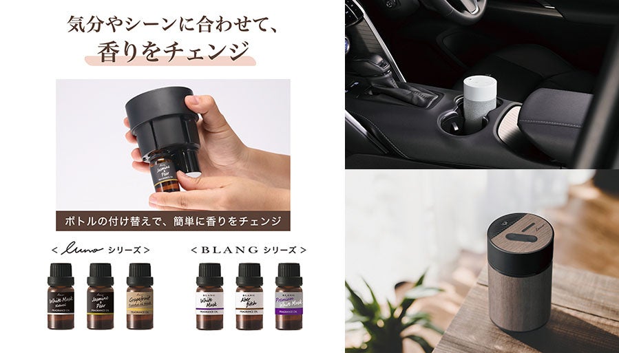 当社では、2020年に大型車でも好みの強さに香りをコントロールできる電機式の『ブラング 噴霧式フレグランスディフューザー』を発売いたしました。専用のフレグランスオイルも同時に発売し、シリーズ出荷累計100万個を超える実績となっております。フレグランスオイルの交換ができ、気分で香りを変えられる点が好評の理由でもある噴霧式フレグランスディフューザー。その特長を活かし”香りから季節の雰囲気を感じることができたら”という想いから本製品の開発に至りました。ドライブのお供に、お部屋でのリラックスタイムに、暖かな温もりのある秋冬の雰囲気を演出します。