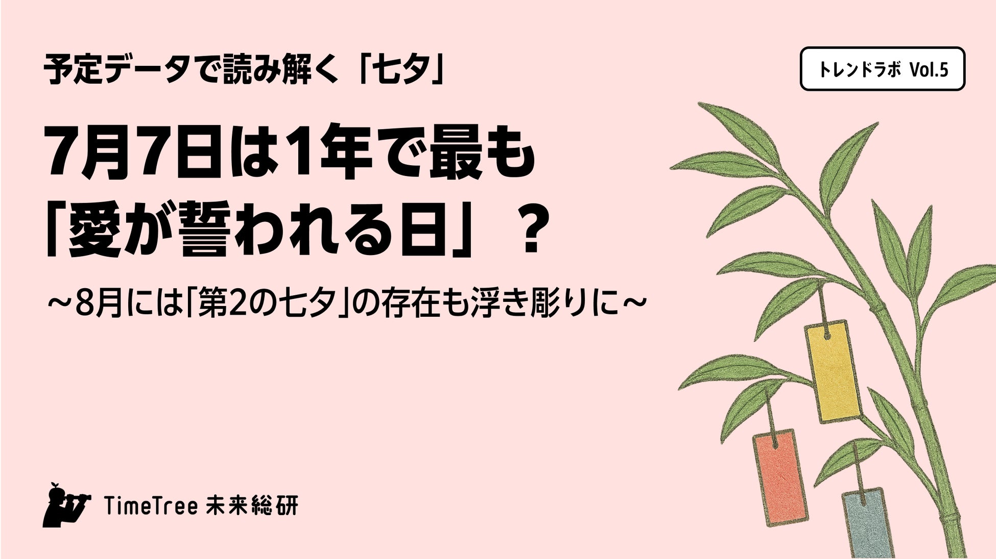 株式会社TimeTree(本社:東京都新宿区、代表取締役社長:深川 泰斗)の社内研究所『TimeTree未来総合研究所』(https://timetreeapp.com/intl/ja/future-research-institute)は、TimeTreeユーザーの予定動向をもとに、「七夕」のトレンドを分析しました。7月7日といえば「七夕」。この日は「織姫と彦星の説話」や「短冊に願いを書く日」として親しまれていますが、TimeTreeの予定データからは、その原点でもある「愛する人と年に一度会える」という物語に共鳴するように、恋人や夫婦が想いを伝え合う日として認知されている実態が見えてきました。