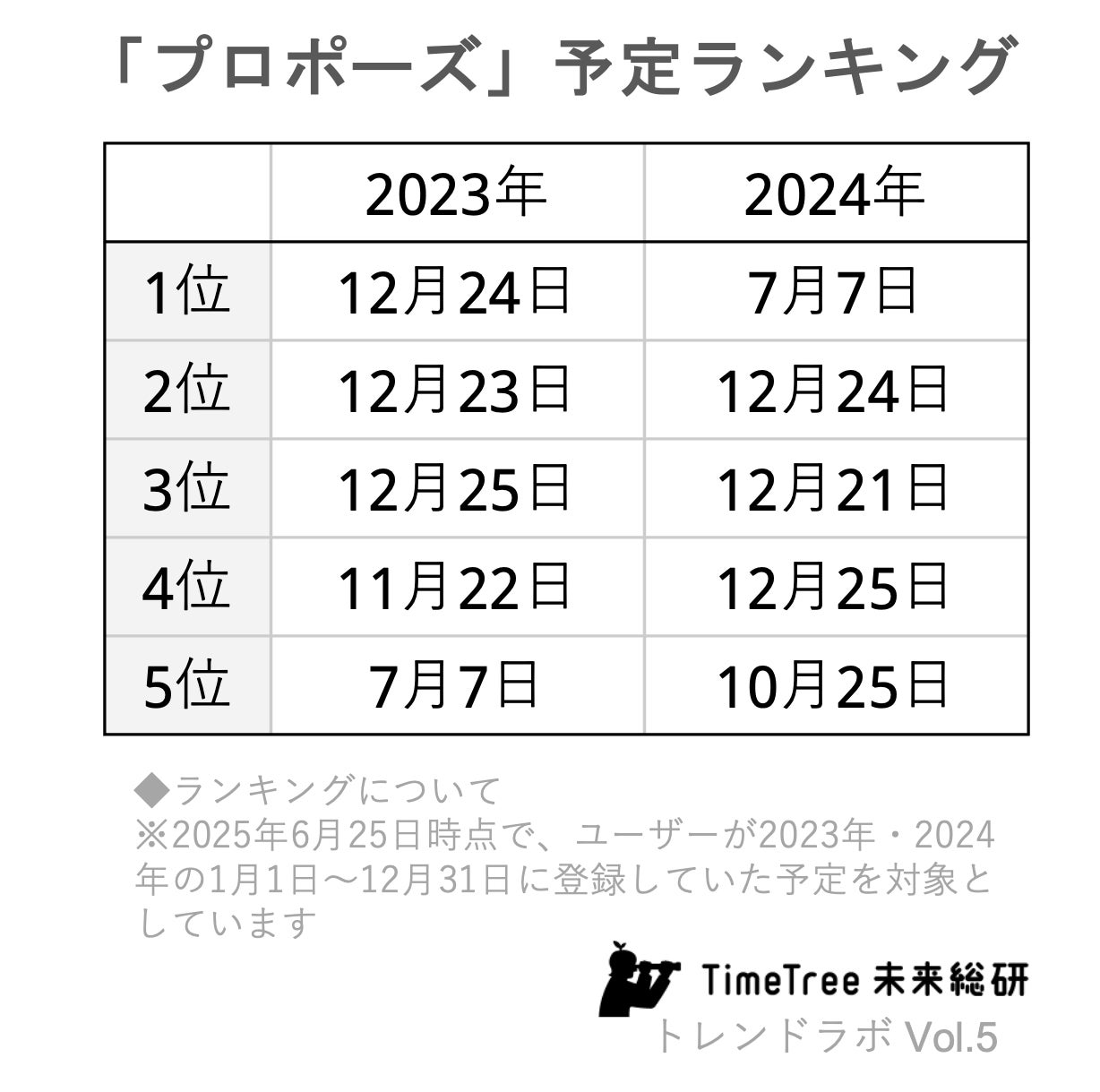 TimeTreeに登録された予定データから、7月7日の七夕が「人生の大切な節目」として選ばれている実態が見えてきました。2024年の「プロポーズ」予定登録データを分析すると、2023年に最多となった12月24日(クリスマスイブ)を抑え、七夕が1位となりました。