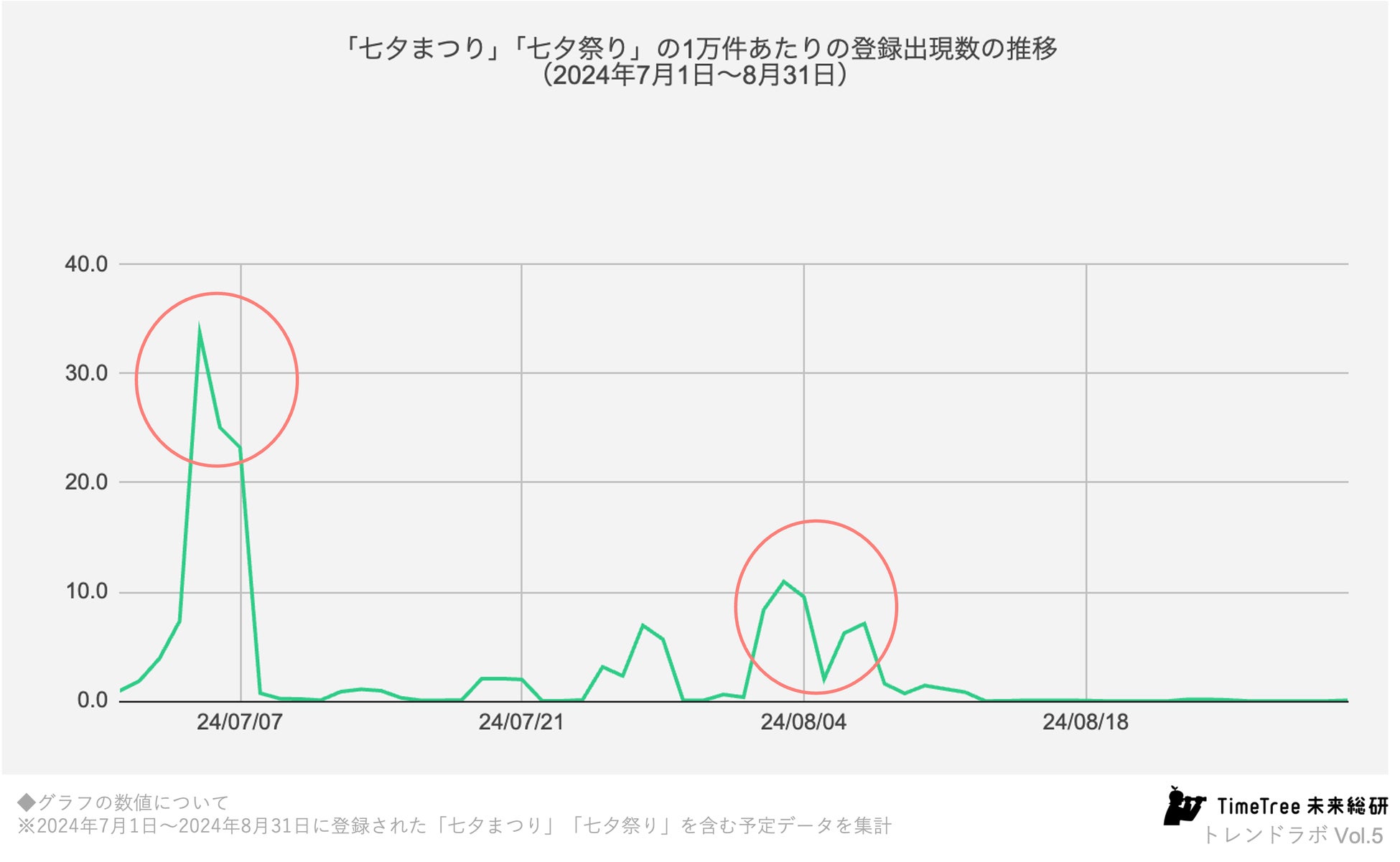 2024年7月〜8月の期間中に「七夕まつり/七夕祭り」を含む予定登録数を見ると、7月7日周辺を中心としたピークに加え、8月上旬にも明確な山が見られました。