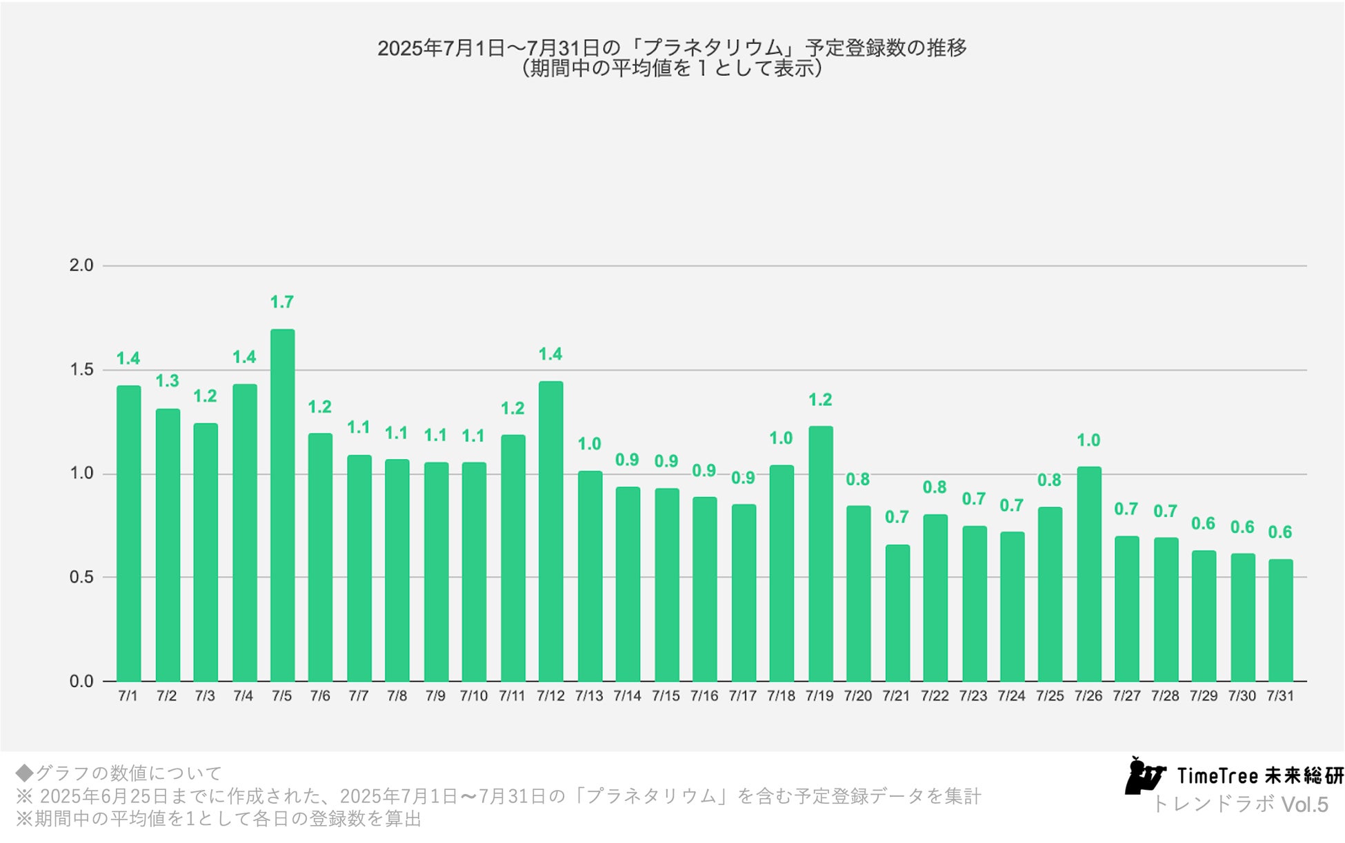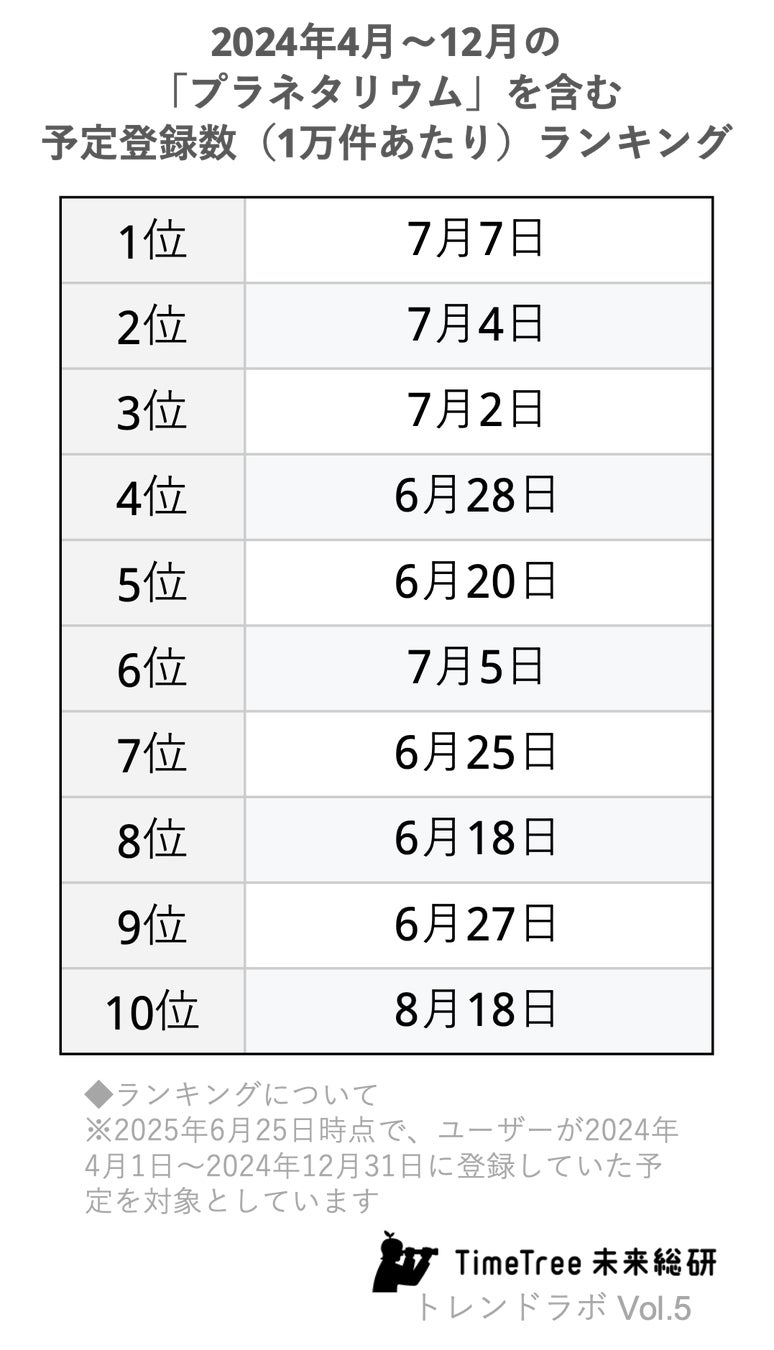 「星に願いを伝える」という七夕のイメージと直結するスポットといえばプラネタリウム。2024年の予定データでは、七夕が日曜日ということも重なったためか、プラネタリウムの予定登録が最も多かったのが7月7日でした。