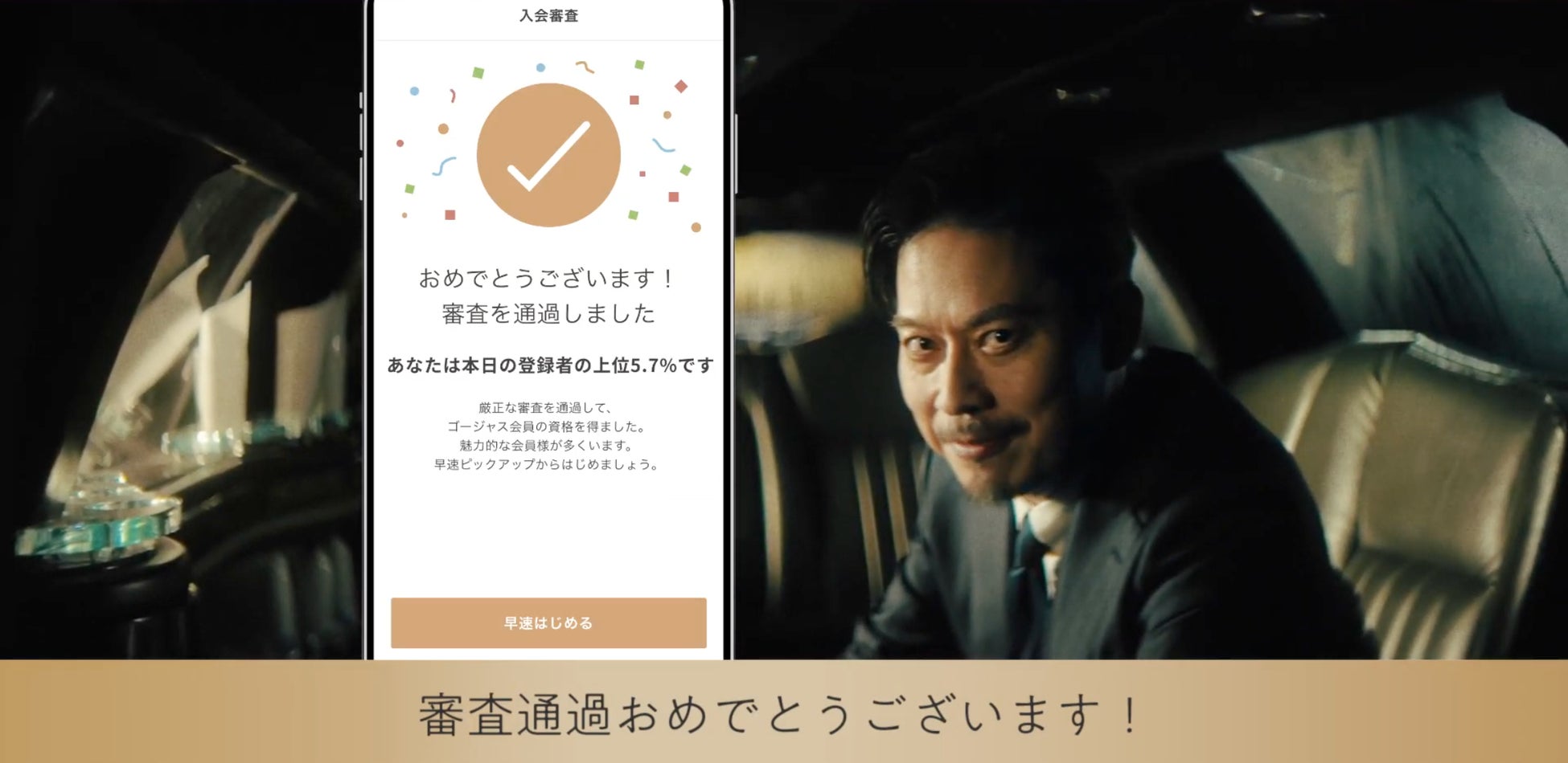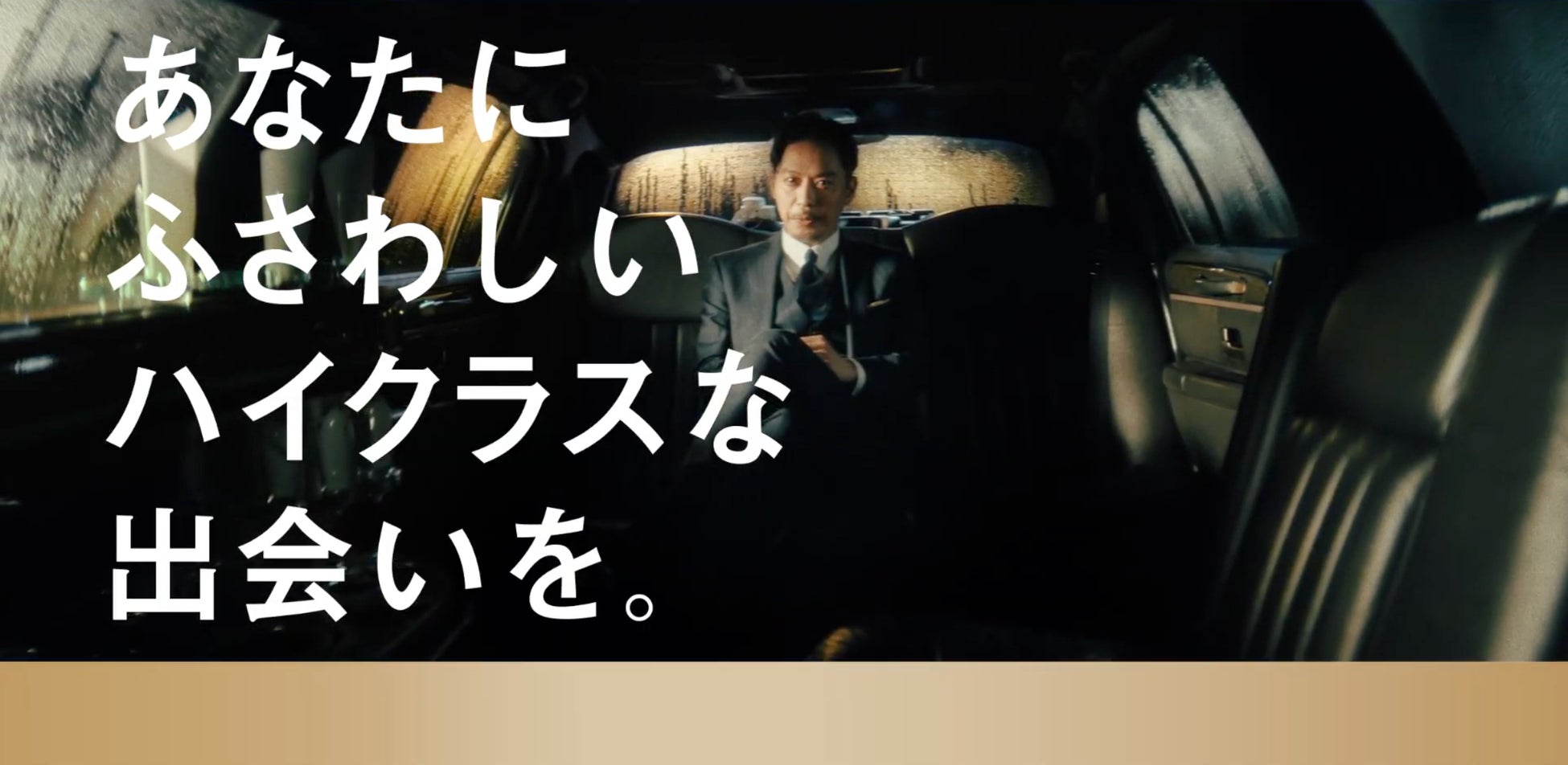 坂東氏の落ち着いた語りと高級感あるハイヤーの洗練された映像で、「理想のお相手とのハイクラスな出会い」を印象づける仕上がりとなっています。