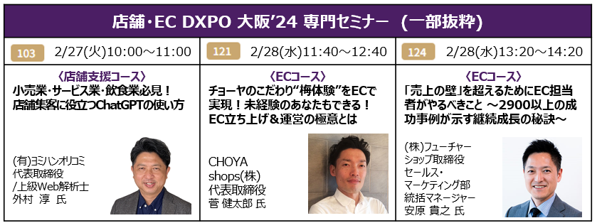 店舗支援コースでは(有)ヨミハンオリコミ 代表取締役 外村淳氏が、ChatGPTを活用して店舗集客に役立てる革新的なマーケティング手法を解説、またECコースでは、全くの未経験からECサイトの構築・運営を手掛けてきたCHOYA shops(株) 代表取締役 菅健太郎氏が、試行錯誤を経て人気サイトに成長させた経験に基づくEC運営の極意を紹介するなど、売上・集客アップを目指す小売業・飲食業・ECのプロ必聴のセミナーが多数開催される。