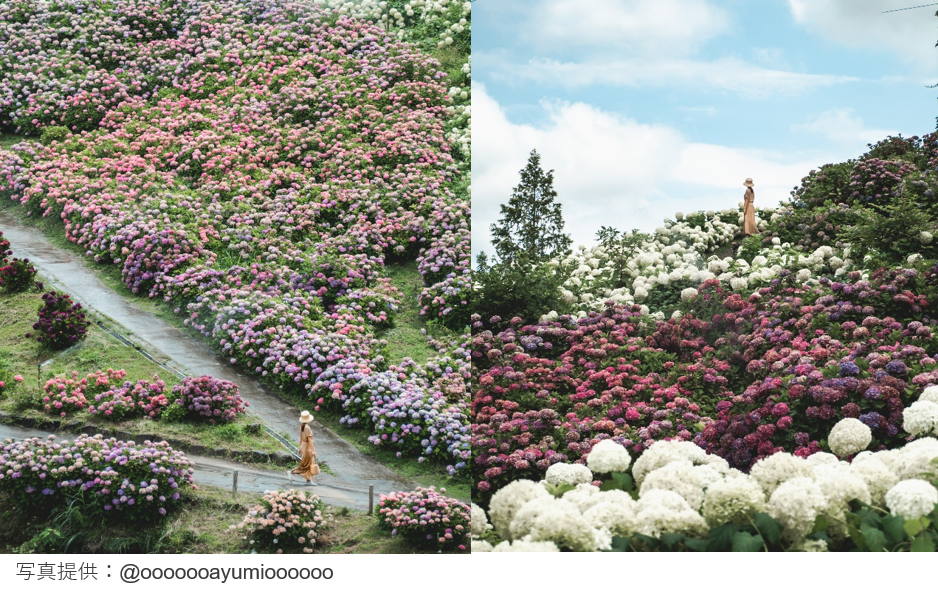 4月下旬から5月上旬は、約8,000㎡に6種の藤棚に9種1,800本の藤の花が咲き、藤の香りがあたり一面に漂い、西日本一の藤棚と評されています。紫陽花は6月が見頃です。