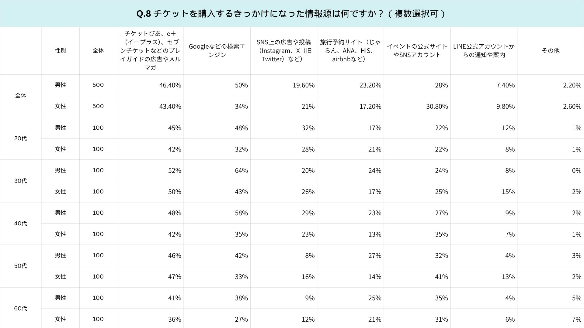 また、50代以上ではチケットぴあやe+などの広告やメルマガが最も多く利用されており、加えてラジオや口コミ、友人からの紹介、ファンクラブからの案内といった従来型の情報源も一定の影響を与えています。