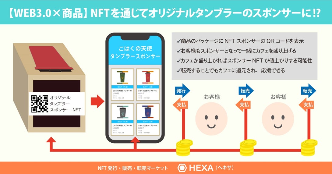 今回のプロジェクトは飲食店業界初の取り組みで、「こはくの天使」が販売しているタンブラーをスポンサーNFTとして発行し、3月17日(木)より14個限定で販売いたします。また、タンブラーに記載されたQRコードからも、スポンサーNFTをご購入いただけます。