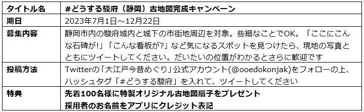 株式会社ビーマップ(本社:東京都千代田区、代表取締役社長:杉野 文則)を幹事会社とする大江戸今昔めぐり製作委員会は、提供するスマートフォン向け古地図アプリ「大江戸今昔めぐり」(以下、本アプリ)において、駿府(静岡)の古地図のスポット強化キャンペーン「#どうする駿府」を7月1日(土)より12月22日(金)まで開催します。ご参加された方のうち先着100名様に特製のオリジナル古地図扇子をプレゼントいたします。
