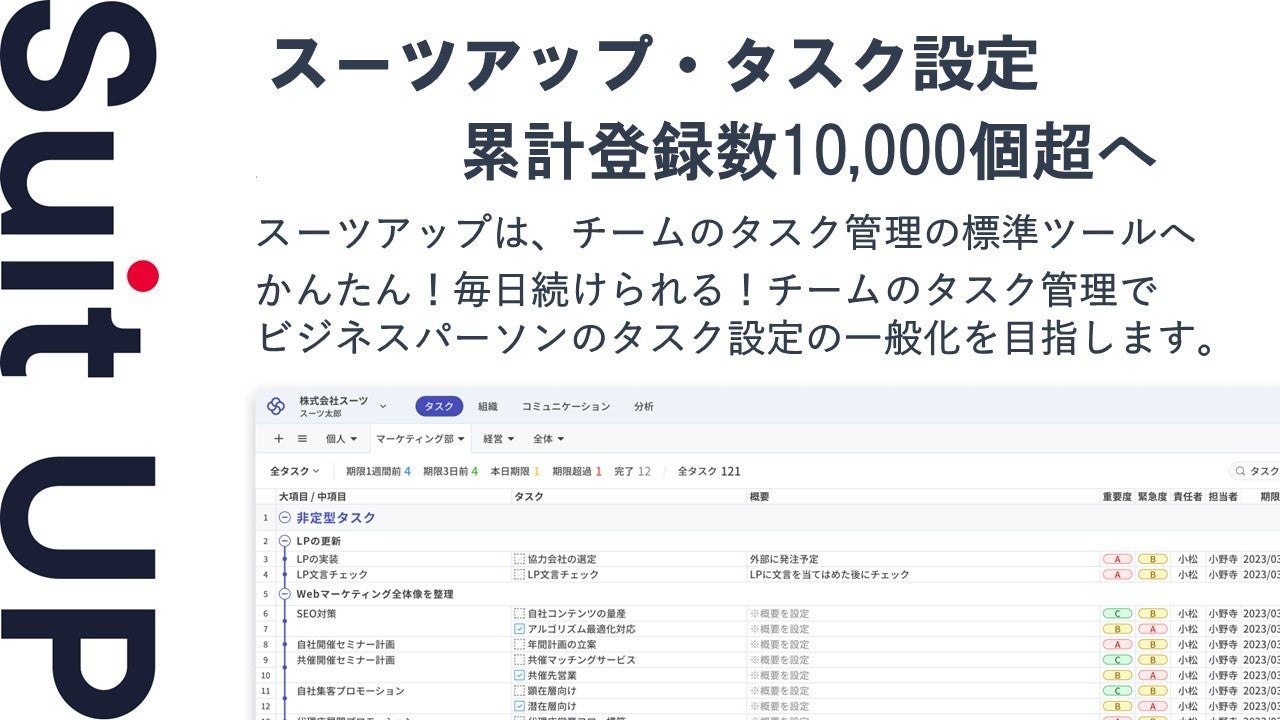 株式会社スーツ(所在地:東京都千代田区、代表取締役社長CEO:小松 裕介)は、2024年9月17日に、チームでかんたん、毎日続けられるプロジェクト・タスク管理ツールの経営支援クラウド「Suit UP」(スーツアップ)のタスク設定の累計登録数が10,000個を超えたことをお知らせします。