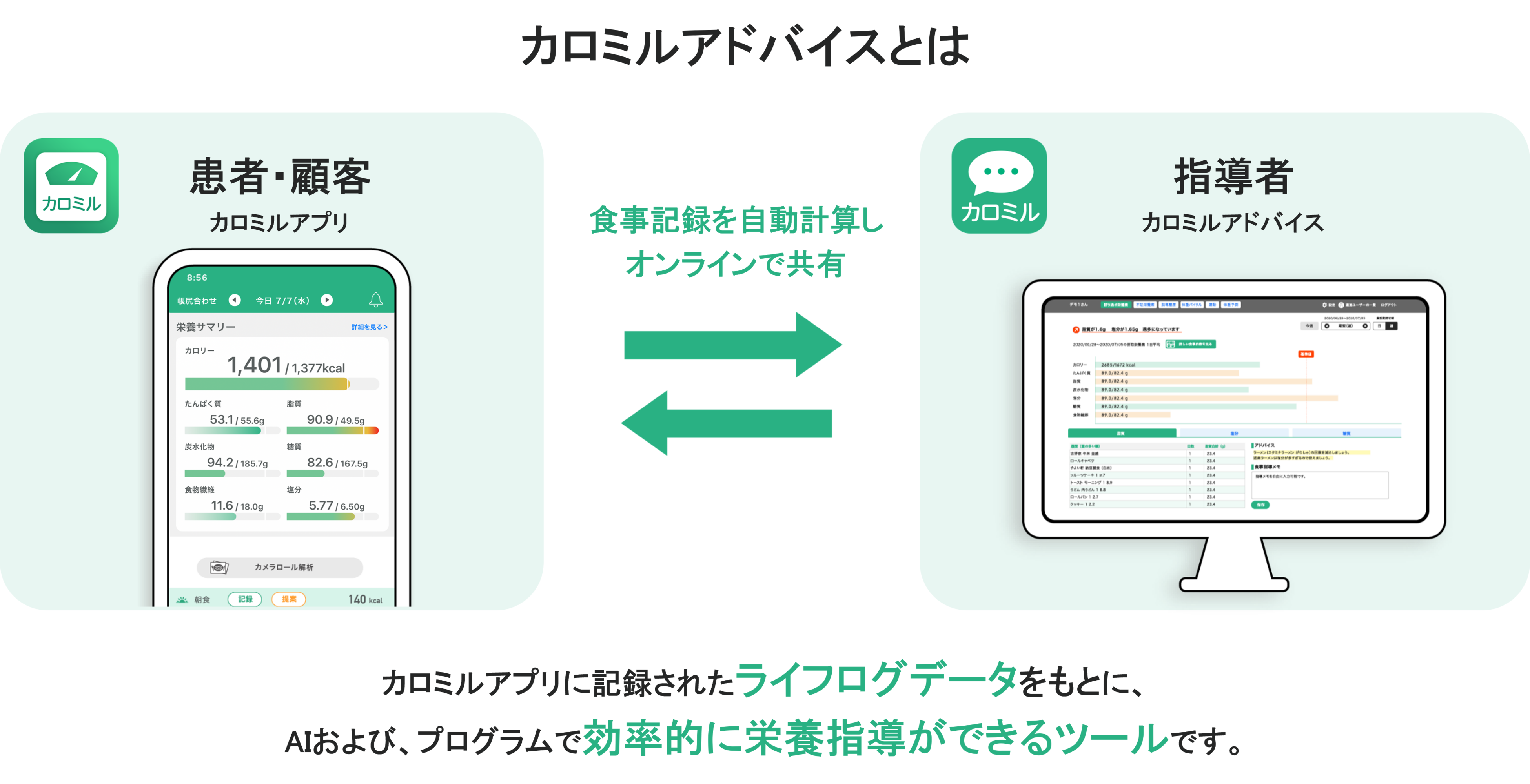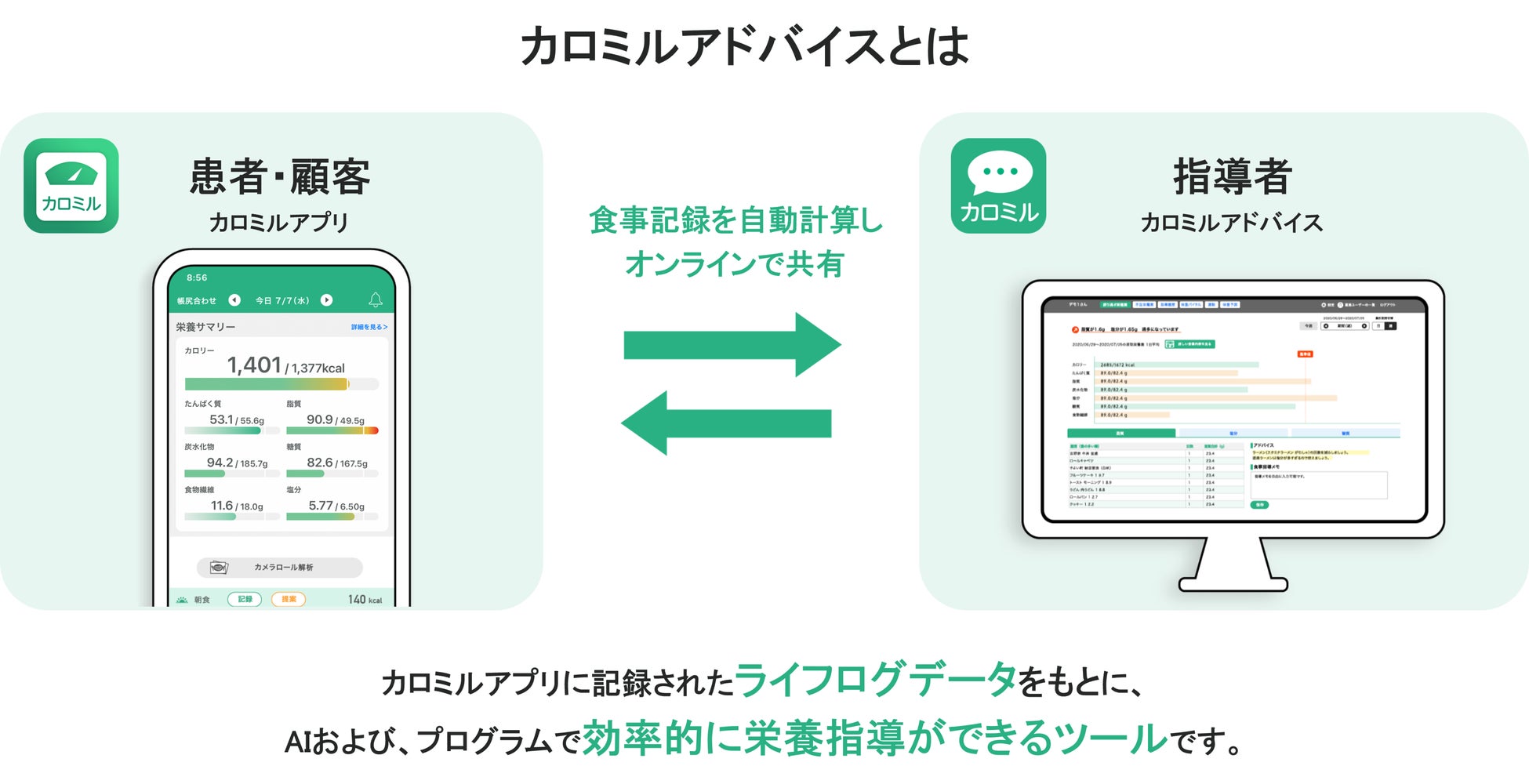 これまで140万人以上のユーザーに選ばれてきたカロミルの強みである「簡単に続けられる食事記録」と、これまで多くの病院、調剤薬局、フィットネスジムに導入頂いてきた指導ツール「カロミルアドバイス」を基に特定保健指導に特化した機能を追加した「カロミル特定保健指導」を組み合わせることで、特定保健指導の要となる食事指導の質、効率を大きく向上させることが出来ます。