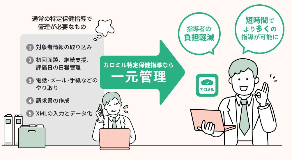 これまで、特定保健指導は保健師や管理栄養士、また法定報告は事務員などの多くの人手と時間をかけて行われていました。カロミル特定保健指導を導入することで、指導者によるシステムへの入力(保健師や管理栄養士など)と対象者によるアプリへの入力のみで、指導報告書やXMLデータなど法定報告用のデータ出力、請求書までを完了することができ、一連の作業の効率改善を実現します。