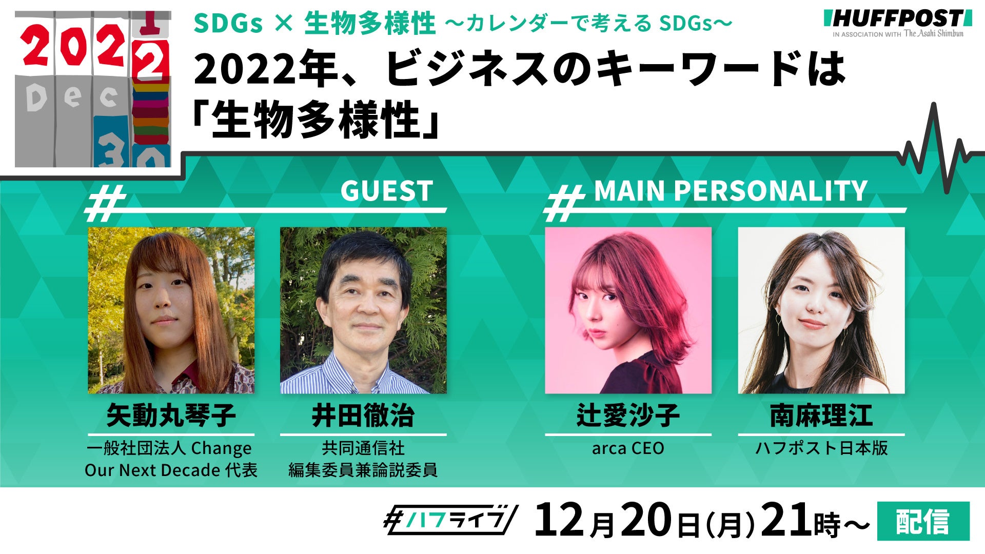 1年間、SDGsをテーマにお届けしてきたハフポスト日本版のオンライン番組「ハフライブ」。年内最後の配信は、1年の総まとめでもあります。気候変動やジェンダー不平等、貧困、教育、そして生物多様性。すべては複雑に絡み合いながら、つながっています。SDGsやサステナビリティに興味、関心をお持ちの皆さんにぜひご覧いただければと思います。ゲストとして出演していただくのは、生物多様性保全のために政策提言や啓発活動をする若者団体の代表を務める矢動丸 琴子さんと、生物多様性など環境問題をテーマに、30年以上にわたって国内外で取材を続けてきた共同通信社編集委員の井田 徹治さんです。