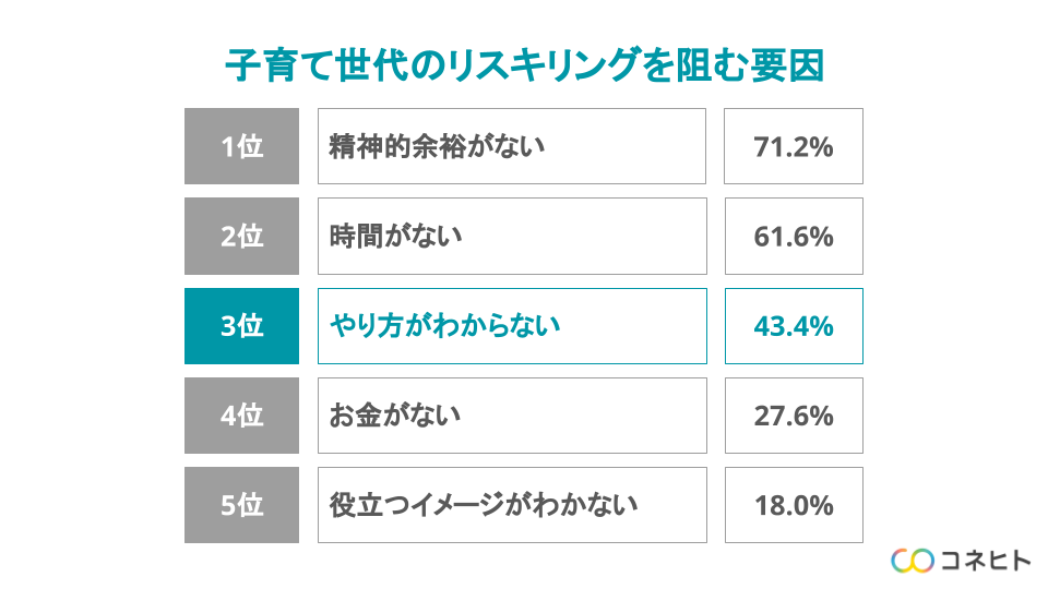 「あなたの家族像が実現できる社会をつくる」をビジョンに掲げるコネヒト株式会社(本社:東京都港区、代表取締役 高橋 恭文、以下「コネヒト」)は、20〜30代の子育て世代を対象に「子育てと仕事に関する調査」を実施しました。当調査の結果からは、リスキリングなどに取り組んでいない理由として4割もの人が「やり方がわからない」と回答。国・企業・個人の三位一体によるリスキリングが必須であるという示唆が得られました。