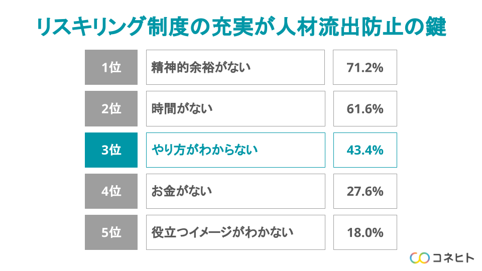 リスキリングを実践しない理由の4割「やり方がわからない」。制度の充実が人材流出防止の鍵