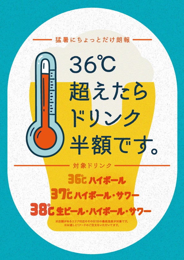 梅雨明け宣言!「酷暑だヨ!全員集合~第1弾」酷暑がちょっとウレシイ企画発動!気温36℃超えたらドリンク半額!