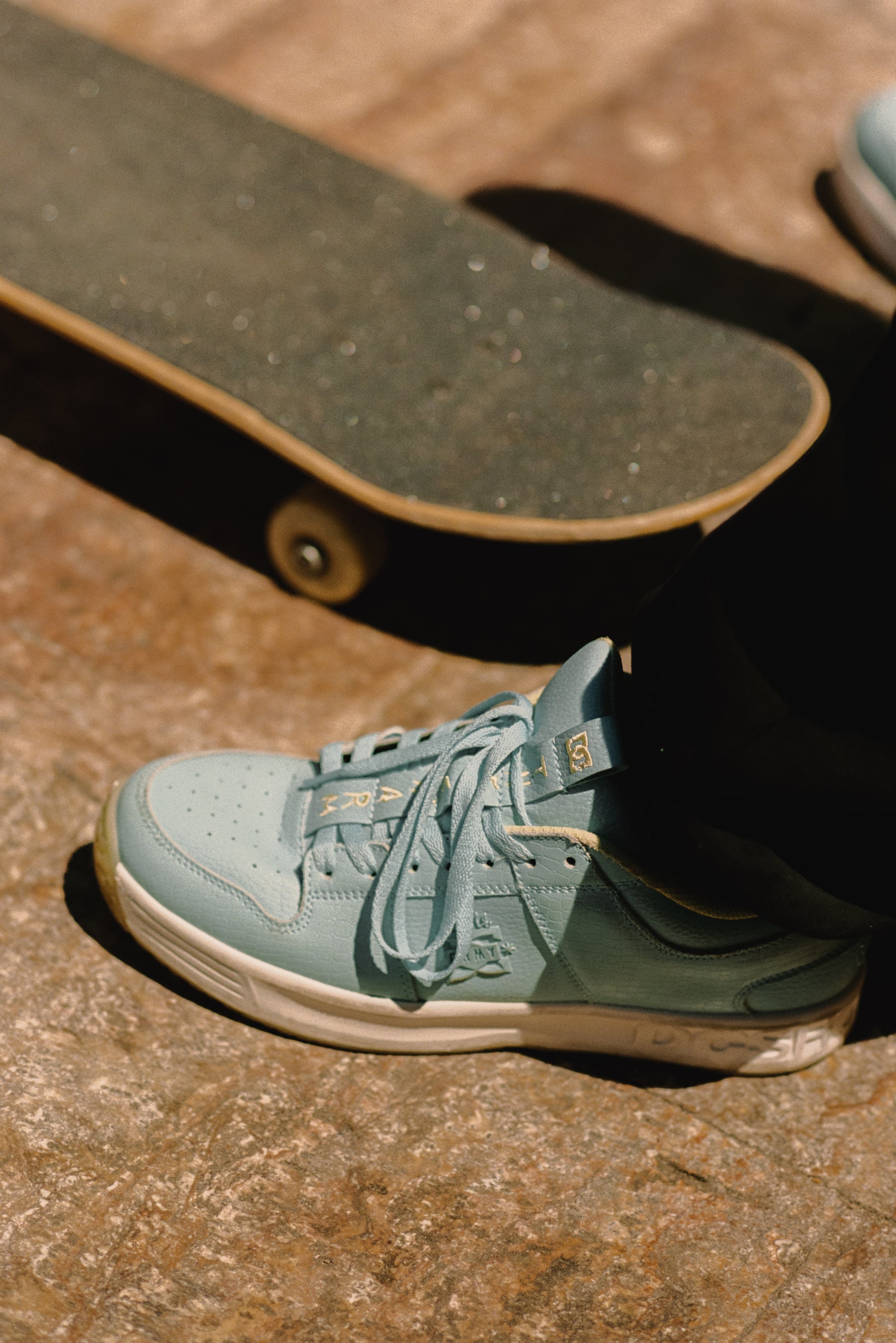 SNEAKERS」が登場!サイドにはこのコラボレーションを象徴するカスタムロゴ、タンのウェビングにはこのコレクションのタイトル「THE SWARM」の刺繍が、さらにヒールにも「GRMY」のブランディングが落とし込まれた、GRIMEYのストリートカルチャーエッセンスが惜しみなく注ぎ込まれたデザインとなっている。もちろん、タフなライディングをサポートするIMPACT-G やEVAストローベルボードを採用し、クッション性と快適なフィット感を提供するタフなスケート仕様となっている。