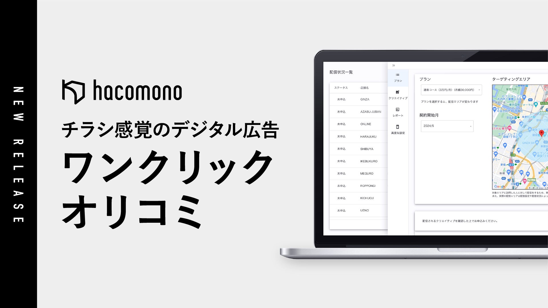 こうしたニーズに応えるため、hacomonoは株式会社ジオロジックが提供する位置情報広告配信システム「GeoLogic Ad(ジオロジック・アド)」と連携し、スマートフォンに折り込みチラシを配布するような感覚で簡単にデジタル広告を出稿し、店舗の認知を拡大することができる「ワンクリックオリコミ」の提供を開始いたします。