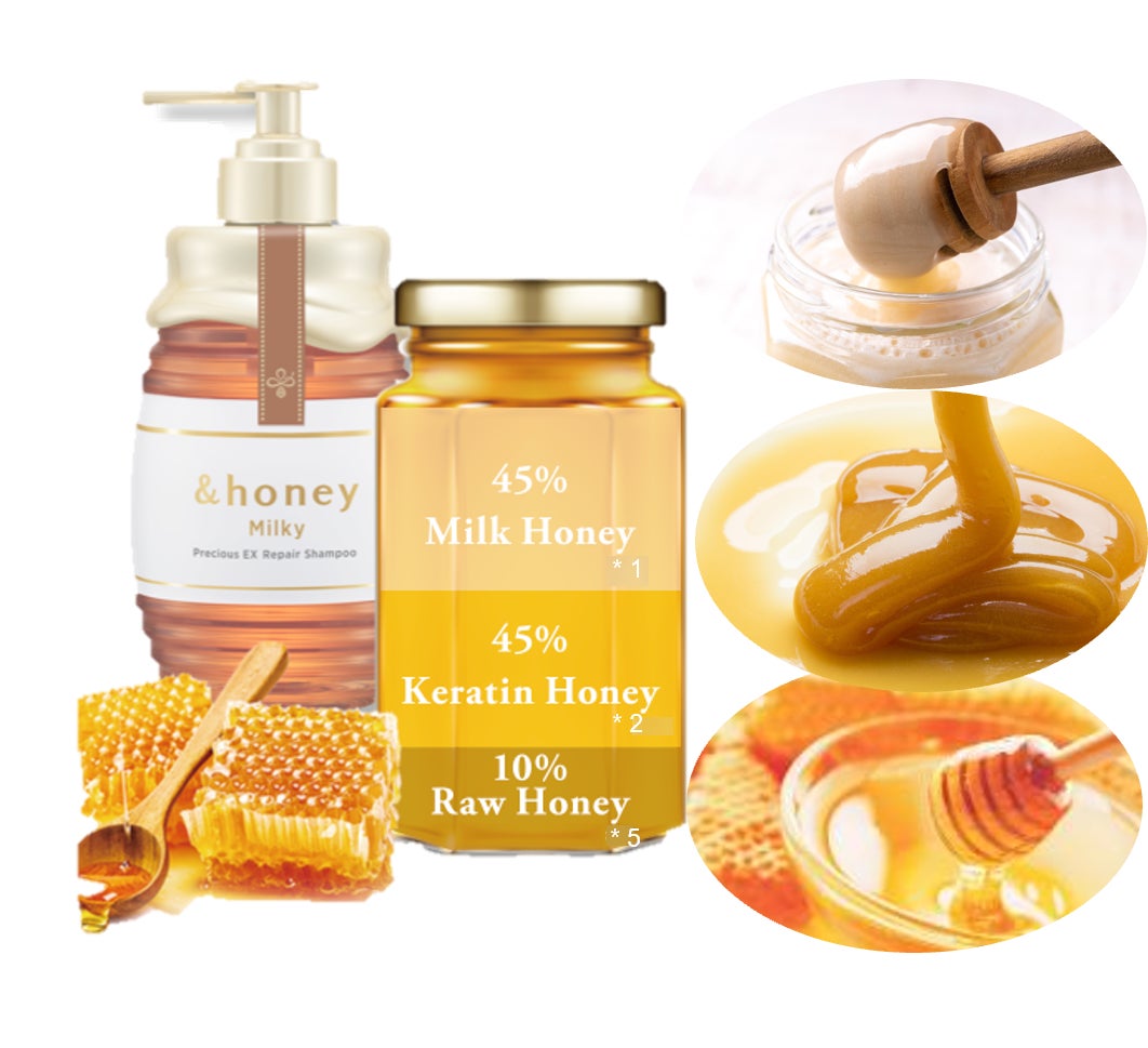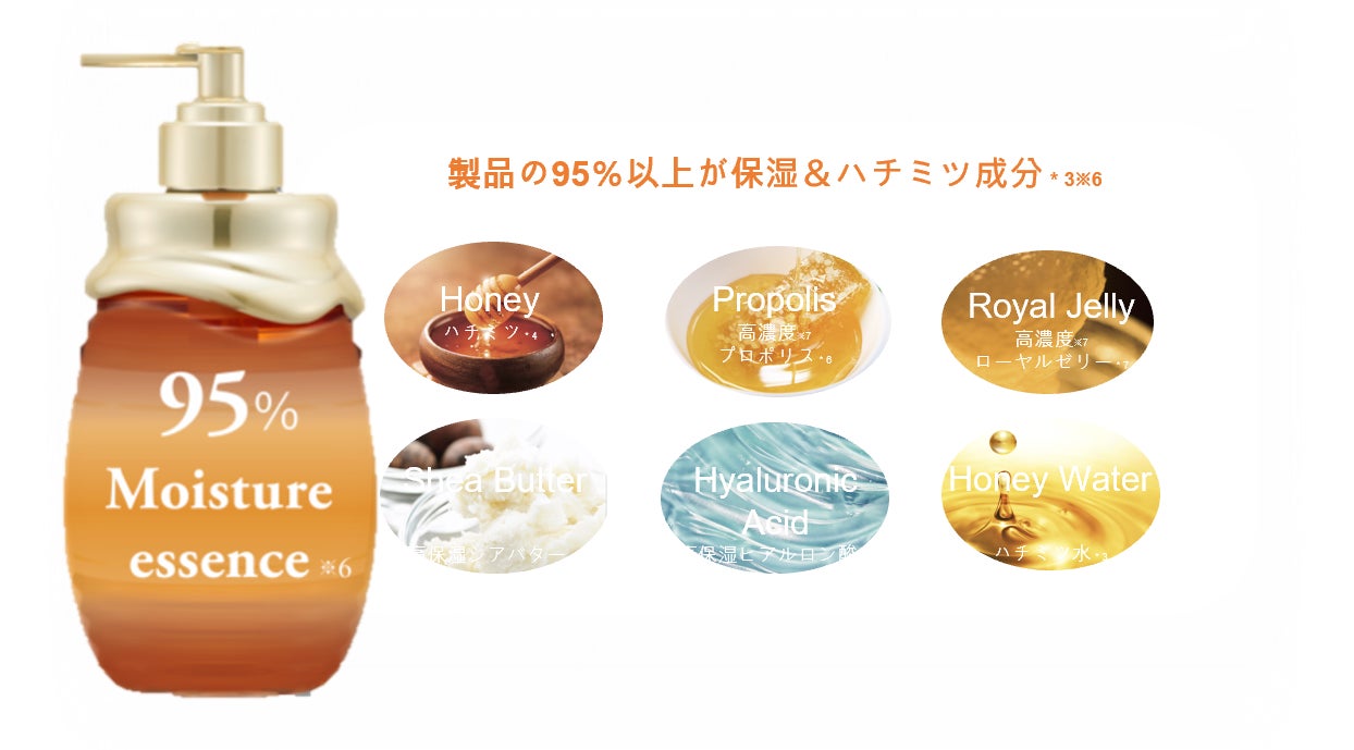 生ハチミツ*5の他に、新たに開発した「ミルクハチミツ*1」「ケラチンハチミツ*2」を贅沢に配合し髪にうるおいとしっとり感を与えます。