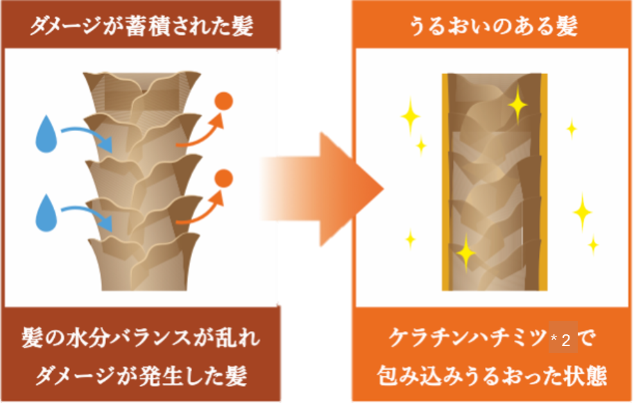 濃縮ケラチンハチミツ*2が髪内部まで浸透し、熱・摩擦・紫外線・ヘアカラー・乾燥などでダメージを受けたパサついた髪を徹底補修します。