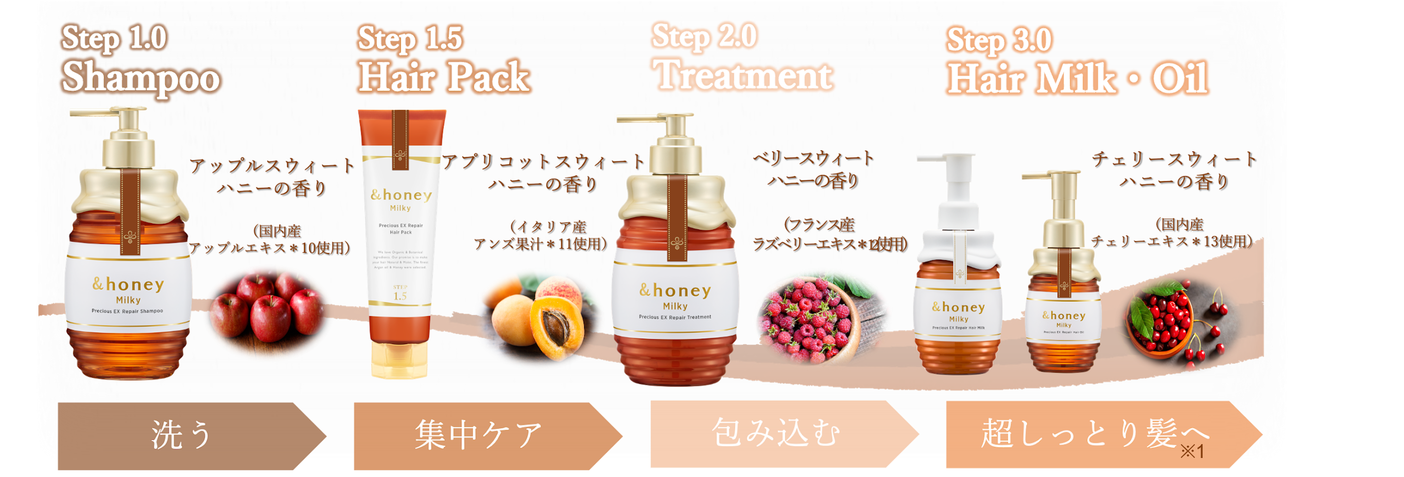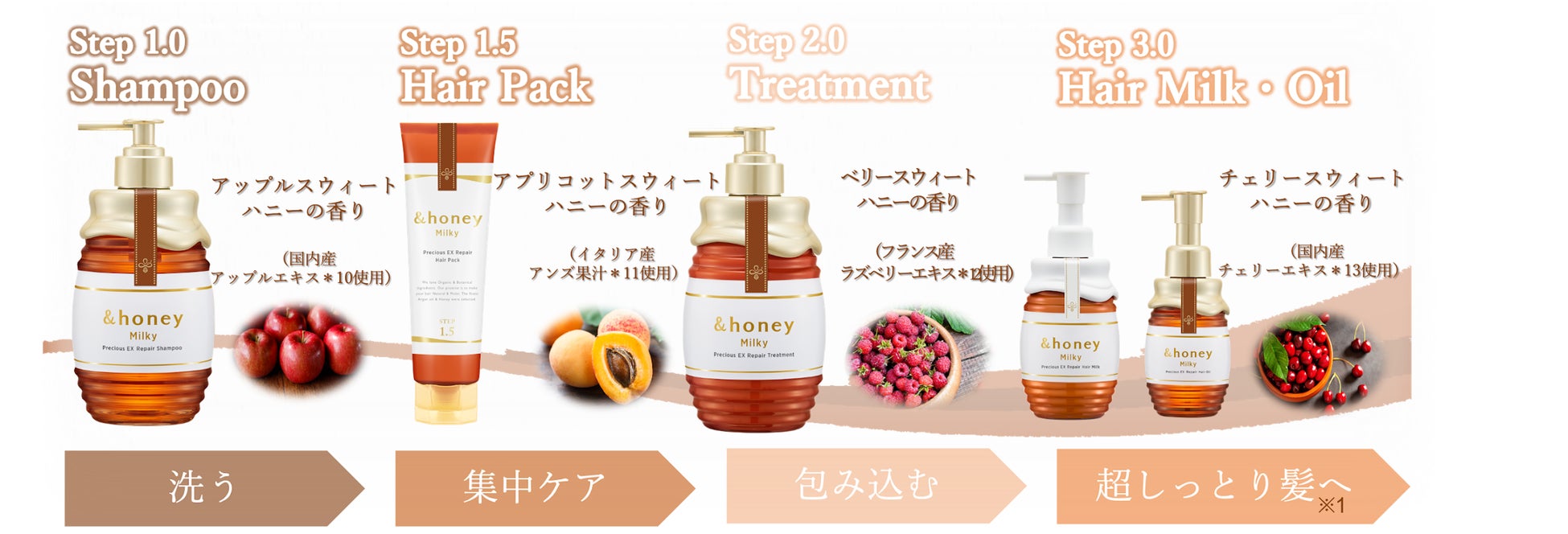 シャンプーは国内産アップルエキス*10を使用したアップルスウィートハニー、ヘアパックはイタリア産アンズ果汁*11を使用したアプリコットスウィートハニー、トリートメントはフランス産ラズベリーエキス*12を使用したラズベリースウィートハニー、ヘアミルクとヘアオイルは国内産チェリーエキス*13を使用したチェリースウィートハニーの香りを採用。