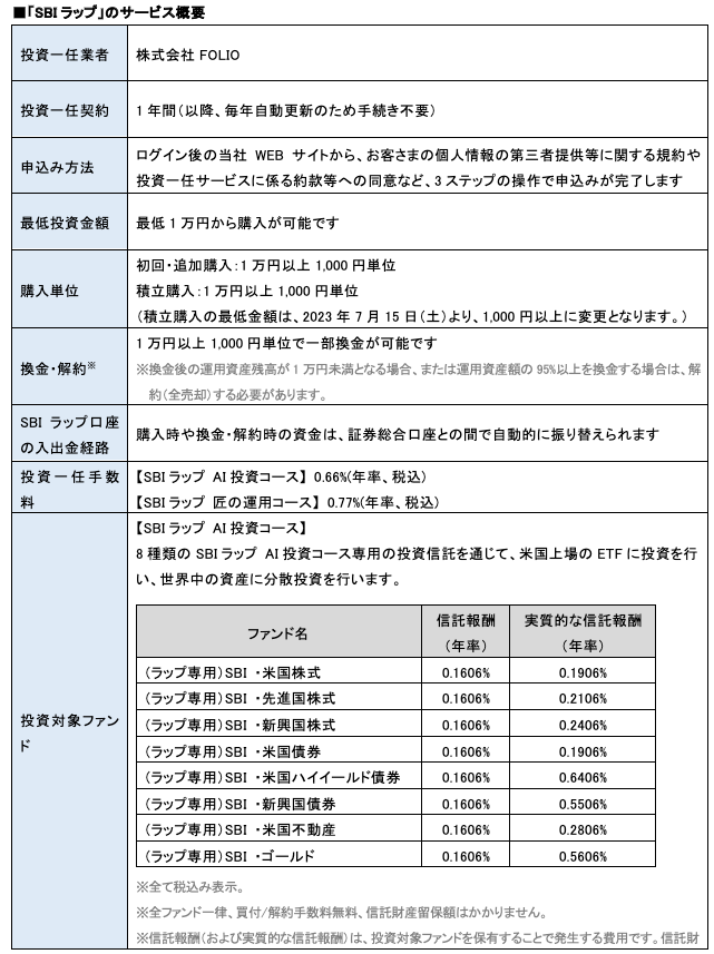 このたび「SBIラップ」は、AI運用ノウハウを活用した従来の投資一任サービスに加えて、業界大手の資産運用会社である野村アセットマネジメントの投資助言による投資一任サービス「SBIラップ 匠の運用コース」(以下「匠ラップ」)の提供を開始します。